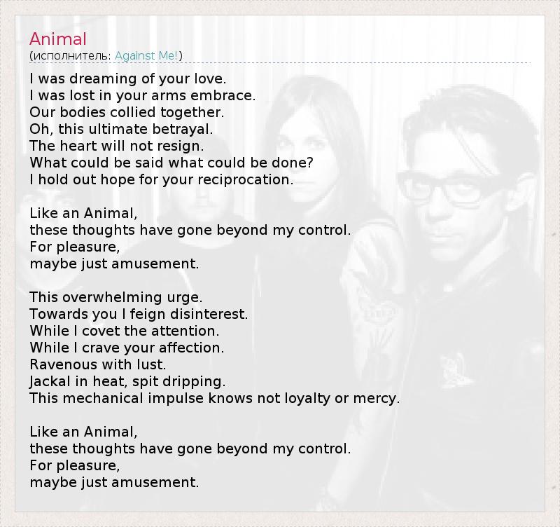 I was dreaming of your love. I was lost in your arms embrace. Our bodies collied together. Oh, this ultimate betrayal. The heart will not resign. What could be said what could be done? I hold out hope for your reciprocation. Like an Animal, these thoughts have gone beyond my control. For pleasure, maybe just amusement. This overwhelming urge. Towards you I feign disinterest. While I covet the attention. While I crave your affection. Ravenous with lust. Jackal in heat, spit dripping. This mechanical impulse knows not loyalty or mercy. Like an Animal, these thoughts have gone beyond my control. For pleasure, maybe just amusement.