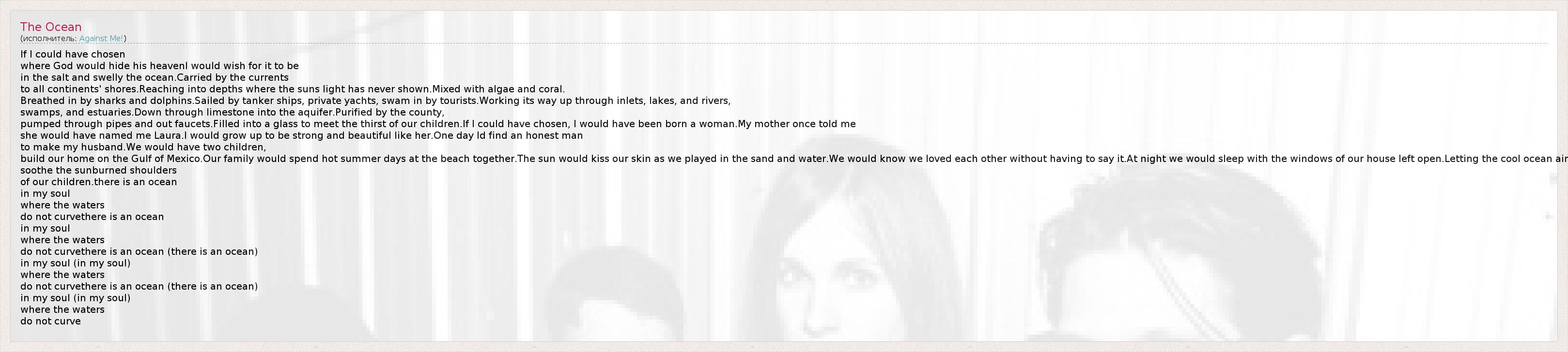 If I could have chosen where God would hide his heavenI would wish for it to be in the salt and swelly the ocean.Carried by the currents to all continents' shores.Reaching into depths where the suns light has never shown.Mixed with algae and coral. Breathed in by sharks and dolphins.Sailed by tanker ships, private yachts, swam in by tourists.Working its way up through inlets, lakes, and rivers, swamps, and estuaries.Down through limestone into the aquifer.Purified by the county, pumped through pipes and out faucets.Filled into a glass to meet the thirst of our children.If I could have chosen, I would have been born a woman.My mother once told me she would have named me Laura.I would grow up to be strong and beautiful like her.One day Id find an honest man to make my husband.We would have two children, build our home on the Gulf of Mexico.Our family would spend hot summer days at the beach together.The sun would kiss our skin as we played in the sand and water.We would know we loved each other without having to say it.At night we would sleep with the windows of our house left open.Letting the cool ocean air soothe the sunburned shoulders of our children.there is an ocean in my soul where the waters do not curvethere is an ocean in my soul where the waters do not curvethere is an ocean (there is an ocean) in my soul (in my soul) where the waters do not curvethere is an ocean (there is an ocean) in my soul (in my soul) where the waters do not curve