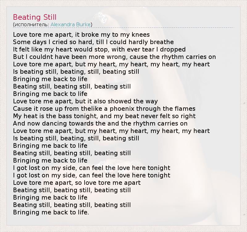 Love tore me apart, it broke my to my knees Some days I cried so hard, till I could hardly breathe It felt like my heart would stop, with ever tear I dropped But I couldnt have been more wrong, cause the rhythm carries on Love tore me apart, but my heart, my heart, my heart, my heart Is beating still, beating, still, beating still Bringing me back to life Beating still, beating still, beating still Bringing me back to life Love tore me apart, but it also showed the way Cause it rose up from thelike a phoenix through the flames My heat is the bass tonight, and my beat never felt so right And now dancing towards the and the rhythm carries on Love tore me apart, but my heart, my heart, my heart, my heart Is beating still, beating, still, beating still Bringing me back to life Beating still, beating still, beating still Bringing me back to life I got lost on my side, can feel the love here tonight I got lost on my side, can feel the love here tonight Love tore me apart, so love tore me apart Beating still, beating still, beating still Bringing me back to life Beating still, beating still, beating still Bringing me back to life.
