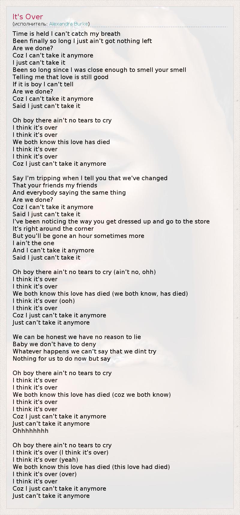 Time is held I can't catch my breath Been finally so long I just ain't got nothing left Are we done? Coz I can't take it anymore I just can't take it Been so long since I was close enough to smell your smell Telling me that love is still good If it is boy I can't tell Are we done? Coz I can't take it anymore Said I just can't take it Oh boy there ain't no tears to cry I think it's over I think it's over We both know this love has died I think it's over I think it's over Coz I just can't take it anymore Say I'm tripping when I tell you that we've changed That your friends my friends And everybody saying the same thing Are we done? Coz I can't take it anymore Said I just can't take it I've been noticing the way you get dressed up and go to the store It's right around the corner But you'll be gone an hour sometimes more I ain't the one And I can't take it anymore Said I just can't take it Oh boy there ain't no tears to cry (ain't no, ohh) I think it's over I think it's over We both know this love has died (we both know, has died) I think it's over (ooh) I think it's over Coz I just can't take it anymore Just can't take it anymore We can be honest we have no reason to lie Baby we don't have to deny Whatever happens we can't say that we dint try Nothing for us to do now but say Oh boy there ain't no tears to cry I think it's over I think it's over We both know this love has died (coz we both know) I think it's over I think it's over Coz I just can't take it anymore Just can't take it anymore Ohhhhhhhh Oh boy there ain't no tears to cry I think it's over (I think it's over) I think it's over (yeah) We both know this love has died (this love had died) I think it's over (over) I think it's over Coz I just can't take it anymore Just can't take it anymore
