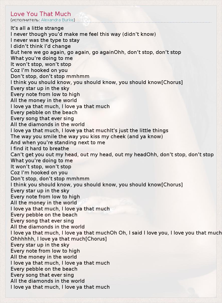 It's all a little strange I never though you'd make me feel this way (didn't know) I never was the type to stay I didn't think I'd change But here we go again, go again, go againOhh, don't stop, don't stop What you're doing to me It won't stop, won't stop Coz I'm hooked on you Don't stop, don't stop mmhmm I think you should know, you should know, you should know[Chorus] Every star up in the sky Every note from low to high All the money in the world I love ya that much, I love ya that much Every pebble on the beach Every song that ever sing All the diamonds in the world I love ya that much, I love ya that muchIt's just the little things The way you smile the way you kiss my cheek (and ya know) And when you're standing next to me I find it hard to breathe Can't get you out my head, out my head, out my headOhh, don't stop, don't stop What you're doing to me It won't stop, won't stop Coz I'm hooked on you Don't stop, don't stop mmhmm I think you should know, you should know, you should know[Chorus] Every star up in the sky Every note from low to high All the money in the world I love ya that much, I love ya that much Every pebble on the beach Every song that ever sing All the diamonds in the world I love ya that much, I love ya that muchOh Oh, I said I love you, I love you that much Ohhhhhh, I love ya that much[Chorus] Every star up in the sky Every note from low to high All the money in the world I love ya that much, I love ya that much Every pebble on the beach Every song that ever sing All the diamonds in the world I love ya that much, I love ya that much