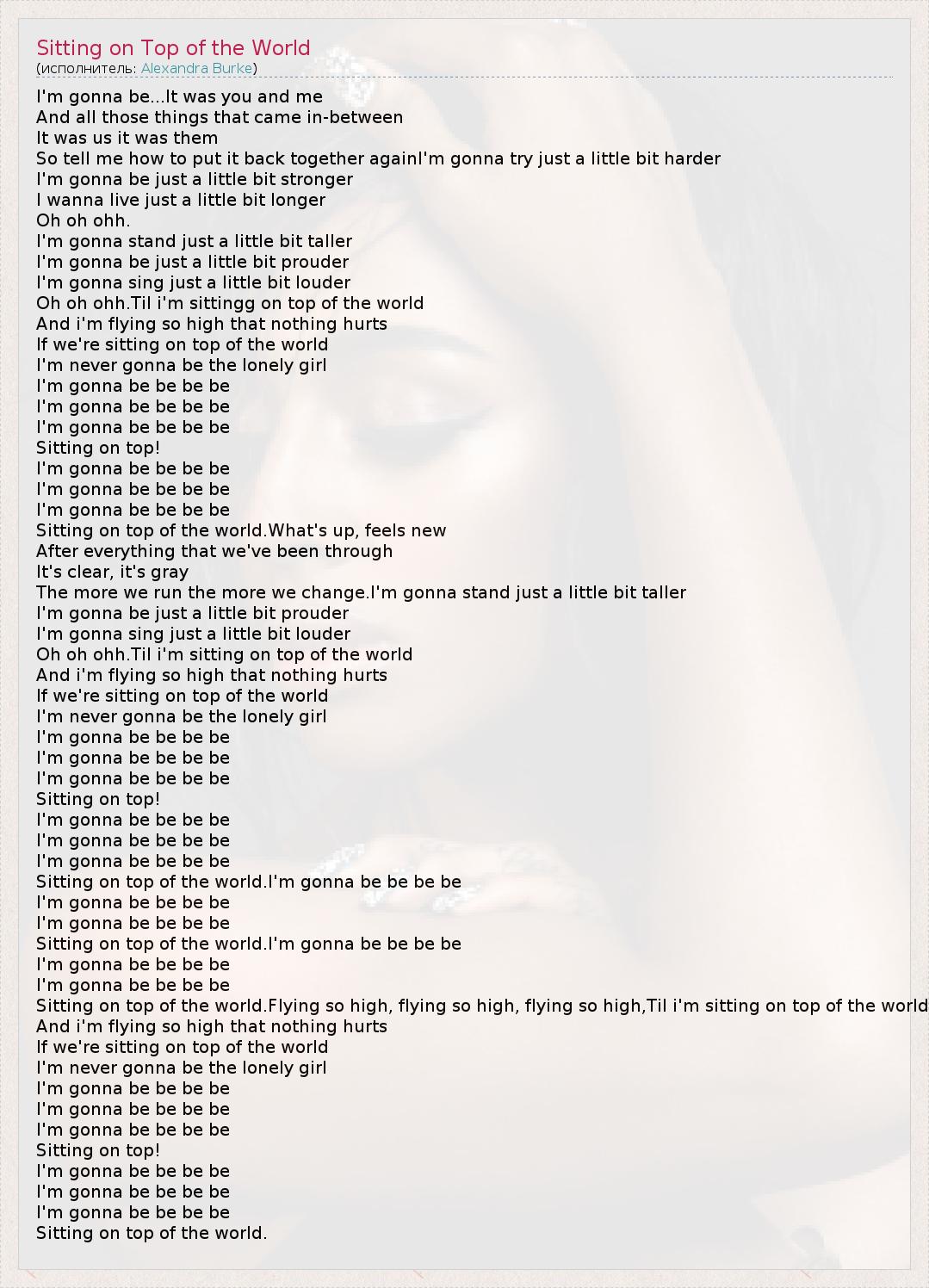 I'm gonna be...It was you and me And all those things that came in-between It was us it was them So tell me how to put it back together againI'm gonna try just a little bit harder I'm gonna be just a little bit stronger I wanna live just a little bit longer Oh oh ohh. I'm gonna stand just a little bit taller I'm gonna be just a little bit prouder I'm gonna sing just a little bit louder Oh oh ohh.Til i'm sittingg on top of the world And i'm flying so high that nothing hurts If we're sitting on top of the world I'm never gonna be the lonely girl I'm gonna be be be be I'm gonna be be be be I'm gonna be be be be Sitting on top! I'm gonna be be be be I'm gonna be be be be I'm gonna be be be be Sitting on top of the world.What's up, feels new After everything that we've been through It's clear, it's gray The more we run the more we change.I'm gonna stand just a little bit taller I'm gonna be just a little bit prouder I'm gonna sing just a little bit louder Oh oh ohh.Til i'm sitting on top of the world And i'm flying so high that nothing hurts If we're sitting on top of the world I'm never gonna be the lonely girl I'm gonna be be be be I'm gonna be be be be I'm gonna be be be be Sitting on top! I'm gonna be be be be I'm gonna be be be be I'm gonna be be be be Sitting on top of the world.I'm gonna be be be be I'm gonna be be be be I'm gonna be be be be Sitting on top of the world.I'm gonna be be be be I'm gonna be be be be I'm gonna be be be be Sitting on top of the world.Flying so high, flying so high, flying so high,Til i'm sitting on top of the world And i'm flying so high that nothing hurts If we're sitting on top of the world I'm never gonna be the lonely girl I'm gonna be be be be I'm gonna be be be be I'm gonna be be be be Sitting on top! I'm gonna be be be be I'm gonna be be be be I'm gonna be be be be Sitting on top of the world.