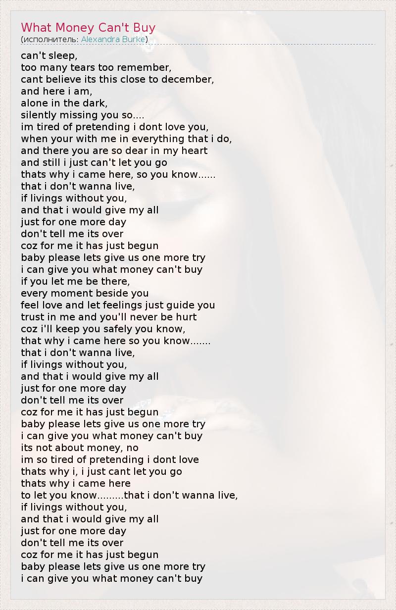 can't sleep, too many tears too remember, cant believe its this close to december, and here i am, alone in the dark, silently missing you so.... im tired of pretending i dont love you, when your with me in everything that i do, and there you are so dear in my heart and still i just can't let you go thats why i came here, so you know...... that i don't wanna live, if livings without you, and that i would give my all just for one more day don't tell me its over coz for me it has just begun baby please lets give us one more try i can give you what money can't buy if you let me be there, every moment beside you feel love and let feelings just guide you trust in me and you'll never be hurt coz i'll keep you safely you know, that why i came here so you know....... that i don't wanna live, if livings without you, and that i would give my all just for one more day don't tell me its over coz for me it has just begun baby please lets give us one more try i can give you what money can't buy its not about money, no im so tired of pretending i dont love thats why i, i just cant let you go thats why i came here to let you know.........that i don't wanna live, if livings without you, and that i would give my all just for one more day don't tell me its over coz for me it has just begun baby please lets give us one more try i can give you what money can't buy
