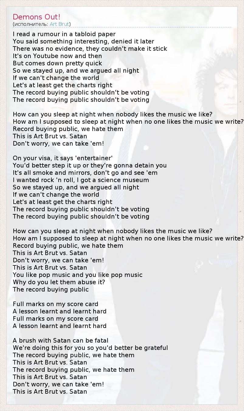 I read a rumour in a tabloid paper You said something interesting, denied it later There was no evidence, they couldn't make it stick It's on Youtube now and then But comes down pretty quick So we stayed up, and we argued all night If we can't change the world Let's at least get the charts right The record buying public shouldn't be voting The record buying public shouldn't be voting How can you sleep at night when nobody likes the music we like? How am I supposed to sleep at night when no one likes the music we write? Record buying public, we hate them This is Art Brut vs. Satan Don't worry, we can take 'em! On your visa, it says 'entertainer' You'd better step it up or they're gonna detain you It's all smoke and mirrors, don't go and see 'em I wanted rock 'n roll, I got a science museum So we stayed up, and we argued all night If we can't change the world Let's at least get the charts right The record buying public shouldn't be voting The record buying public shouldn't be voting How can you sleep at night when nobody likes the music we like? How am I supposed to sleep at night when no one likes the music we write? Record buying public, we hate them This is Art Brut vs. Satan Don't worry, we can take 'em! This is Art Brut vs. Satan You like pop music and you like pop music Why do you let them abuse it? The record buying public Full marks on my score card A lesson learnt and learnt hard Full marks on my score card A lesson learnt and learnt hard A brush with Satan can be fatal We're doing this for you so you'd better be grateful The record buying public, we hate them This is Art Brut vs. Satan The record buying public, we hate them This is Art Brut vs. Satan Don't worry, we can take 'em! This is Art Brut vs. Satan
