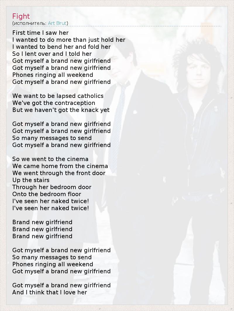 First time I saw her I wanted to do more than just hold her I wanted to bend her and fold her So I lent over and I told her Got myself a brand new girlfriend Got myself a brand new girlfriend Phones ringing all weekend Got myself a brand new girlfriend We want to be lapsed catholics We've got the contraception But we haven't got the knack yet Got myself a brand new girlfriend Got myself a brand new girlfriend So many messages to send Got myself a brand new girlfriend So we went to the cinema We came home from the cinema We went through the front door Up the stairs Through her bedroom door Onto the bedroom floor I've seen her naked twice! I've seen her naked twice! Brand new girlfriend Brand new girlfriend Brand new girlfriend Got myself a brand new girlfriend So many messages to send Phones ringing all weekend Got myself a brand new girlfriend Got myself a brand new girlfriend And I think that I love her