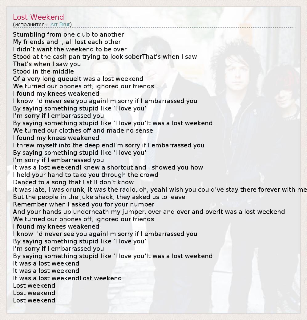 Stumbling from one club to another My friends and I, all lost each other I didn't want the weekend to be over Stood at the cash pan trying to look soberThat's when I saw That's when I saw you Stood in the middle Of a very long queueIt was a lost weekend We turned our phones off, ignored our friends I found my knees weakened I know I'd never see you againI'm sorry if I embarrassed you By saying something stupid like 'I love you' I'm sorry if I embarrassed you By saying something stupid like 'I love you'It was a lost weekend We turned our clothes off and made no sense I found my knees weakened I threw myself into the deep endI'm sorry if I embarrassed you By saying something stupid like 'I love you' I'm sorry if I embarrassed you It was a lost weekendI knew a shortcut and I showed you how I held your hand to take you through the crowd Danced to a song that I still don't know It was late, I was drunk, it was the radio, oh, yeahI wish you could've stay there forever with me But the people in the juke shack, they asked us to leave Remember when I asked you for your number And your hands up underneath my jumper, over and over and overIt was a lost weekend We turned our phones off, ignored our friends I found my knees weakened I know I'd never see you againI'm sorry if I embarrassed you By saying something stupid like 'I love you' I'm sorry if I embarrassed you By saying something stupid like 'I love you'It was a lost weekend It was a lost weekend It was a lost weekend It was a lost weekendLost weekend Lost weekend Lost weekend Lost weekend
