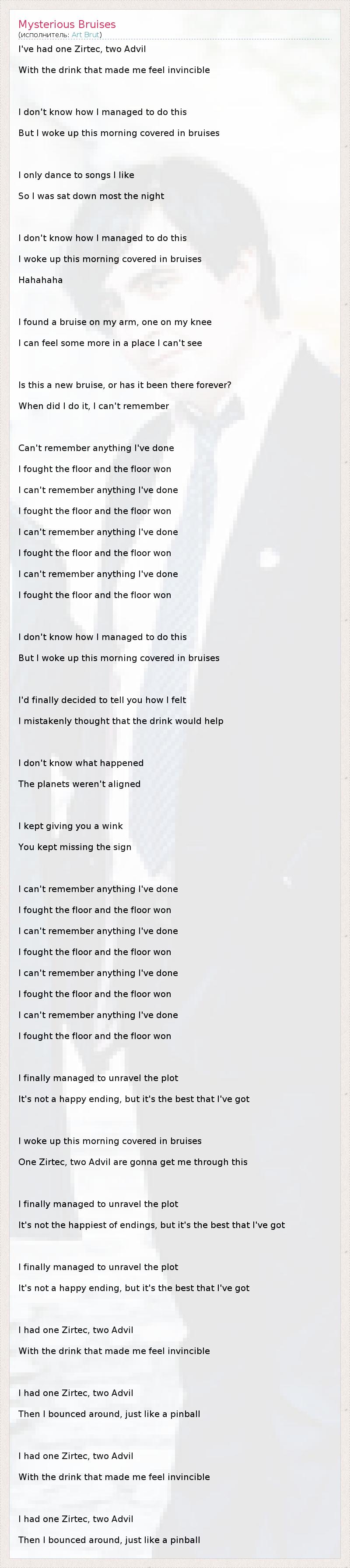 I've had one Zirtec, two Advil With the drink that made me feel invincible I don't know how I managed to do this But I woke up this morning covered in bruises I only dance to songs I like So I was sat down most the night I don't know how I managed to do this I woke up this morning covered in bruises Hahahaha I found a bruise on my arm, one on my knee I can feel some more in a place I can't see Is this a new bruise, or has it been there forever? When did I do it, I can't remember Can't remember anything I've done I fought the floor and the floor won I can't remember anything I've done I fought the floor and the floor won I can't remember anything I've done I fought the floor and the floor won I can't remember anything I've done I fought the floor and the floor won I don't know how I managed to do this But I woke up this morning covered in bruises I'd finally decided to tell you how I felt I mistakenly thought that the drink would help I don't know what happened The planets weren't aligned I kept giving you a wink You kept missing the sign I can't remember anything I've done I fought the floor and the floor won I can't remember anything I've done I fought the floor and the floor won I can't remember anything I've done I fought the floor and the floor won I can't remember anything I've done I fought the floor and the floor won I finally managed to unravel the plot It's not a happy ending, but it's the best that I've got I woke up this morning covered in bruises One Zirtec, two Advil are gonna get me through this I finally managed to unravel the plot It's not the happiest of endings, but it's the best that I've got I finally managed to unravel the plot It's not a happy ending, but it's the best that I've got I had one Zirtec, two Advil With the drink that made me feel invincible I had one Zirtec, two Advil Then I bounced around, just like a pinball I had one Zirtec, two Advil With the drink that made me feel invincible I had one Zirtec, two Advil Then I bounced around, just like a pinball
