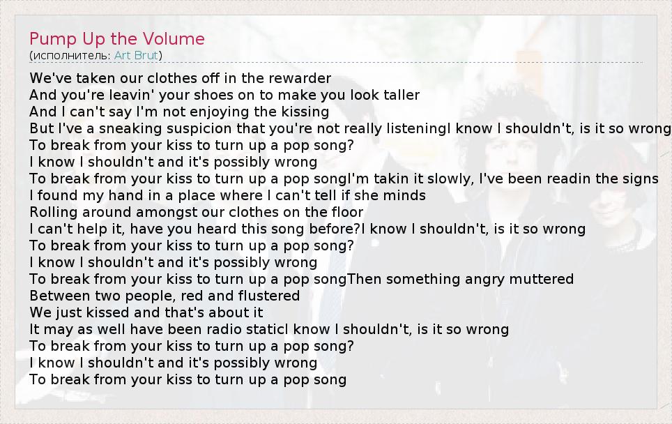 We've taken our clothes off in the rewarder And you're leavin' your shoes on to make you look taller And I can't say I'm not enjoying the kissing But I've a sneaking suspicion that you're not really listeningI know I shouldn't, is it so wrong To break from your kiss to turn up a pop song? I know I shouldn't and it's possibly wrong To break from your kiss to turn up a pop songI'm takin it slowly, I've been readin the signs I found my hand in a place where I can't tell if she minds Rolling around amongst our clothes on the floor I can't help it, have you heard this song before?I know I shouldn't, is it so wrong To break from your kiss to turn up a pop song? I know I shouldn't and it's possibly wrong To break from your kiss to turn up a pop songThen something angry muttered Between two people, red and flustered We just kissed and that's about it It may as well have been radio staticI know I shouldn't, is it so wrong To break from your kiss to turn up a pop song? I know I shouldn't and it's possibly wrong To break from your kiss to turn up a pop song