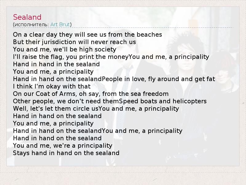 On a clear day they will see us from the beaches But their jurisdiction will never reach us You and me, we'll be high society I'll raise the flag, you print the moneyYou and me, a principality Hand in hand in the sealand You and me, a principality Hand in hand on the sealandPeople in love, fly around and get fat I think I'm okay with that On our Coat of Arms, oh say, from the sea freedom Other people, we don't need themSpeed boats and helicopters Well, let's let them circle usYou and me, a principality Hand in hand on the sealand You and me, a principality Hand in hand on the sealandYou and me, a principality Hand in hand on the sealand You and me, we're a principality Stays hand in hand on the sealand