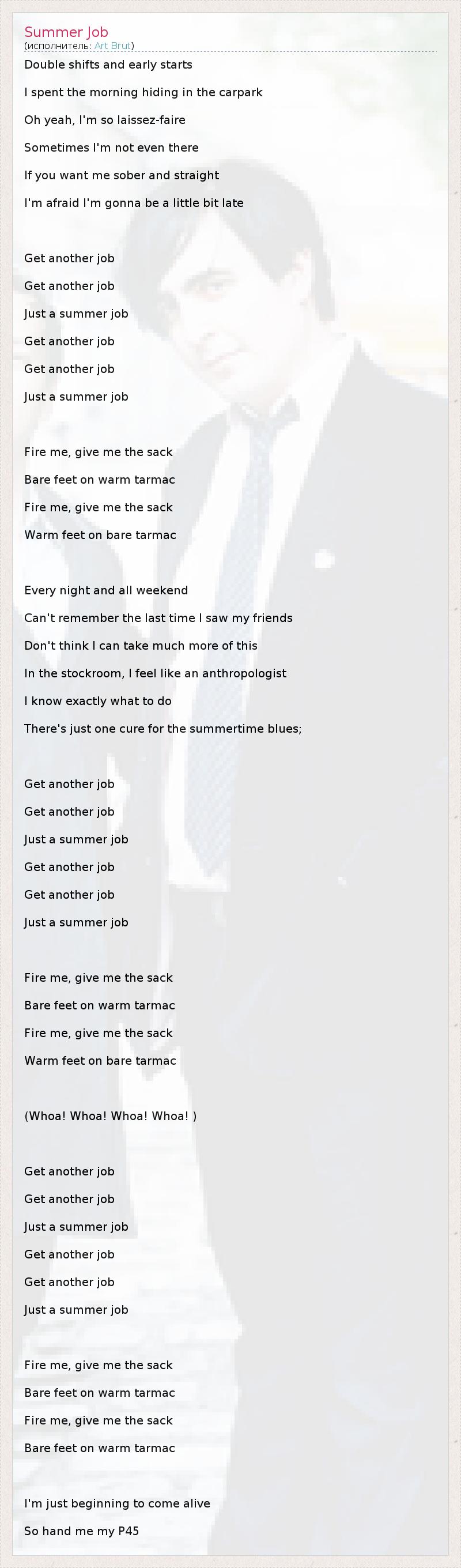 Double shifts and early starts I spent the morning hiding in the carpark Oh yeah, I'm so laissez-faire Sometimes I'm not even there If you want me sober and straight I'm afraid I'm gonna be a little bit late Get another job Get another job Just a summer job Get another job Get another job Just a summer job Fire me, give me the sack Bare feet on warm tarmac Fire me, give me the sack Warm feet on bare tarmac Every night and all weekend Can't remember the last time I saw my friends Don't think I can take much more of this In the stockroom, I feel like an anthropologist I know exactly what to do There's just one cure for the summertime blues; Get another job Get another job Just a summer job Get another job Get another job Just a summer job Fire me, give me the sack Bare feet on warm tarmac Fire me, give me the sack Warm feet on bare tarmac (Whoa! Whoa! Whoa! Whoa! ) Get another job Get another job Just a summer job Get another job Get another job Just a summer job Fire me, give me the sack Bare feet on warm tarmac Fire me, give me the sack Bare feet on warm tarmac I'm just beginning to come alive So hand me my P45
