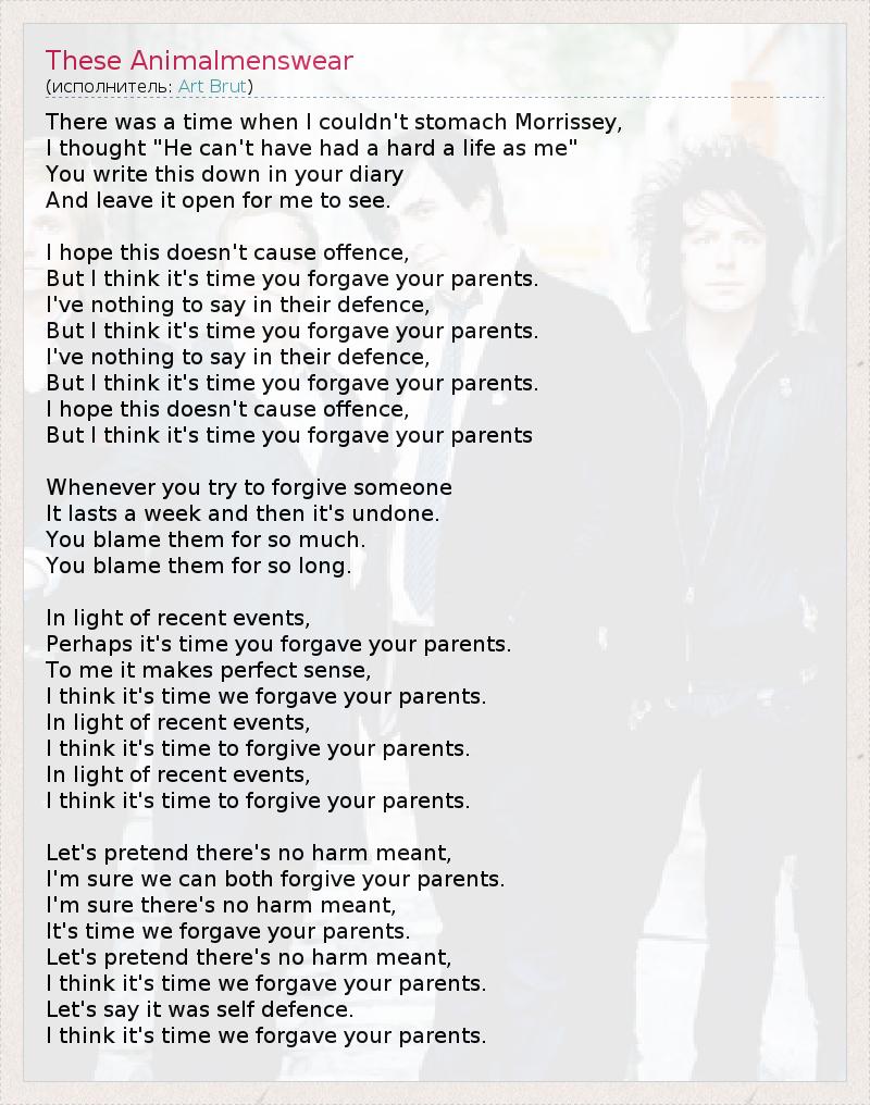 There was a time when I couldn't stomach Morrissey, I thought "He can't have had a hard a life as me" You write this down in your diary And leave it open for me to see. I hope this doesn't cause offence, But I think it's time you forgave your parents. I've nothing to say in their defence, But I think it's time you forgave your parents. I've nothing to say in their defence, But I think it's time you forgave your parents. I hope this doesn't cause offence, But I think it's time you forgave your parents Whenever you try to forgive someone It lasts a week and then it's undone. You blame them for so much. You blame them for so long. In light of recent events, Perhaps it's time you forgave your parents. To me it makes perfect sense, I think it's time we forgave your parents. In light of recent events, I think it's time to forgive your parents. In light of recent events, I think it's time to forgive your parents. Let's pretend there's no harm meant, I'm sure we can both forgive your parents. I'm sure there's no harm meant, It's time we forgave your parents. Let's pretend there's no harm meant, I think it's time we forgave your parents. Let's say it was self defence. I think it's time we forgave your parents.