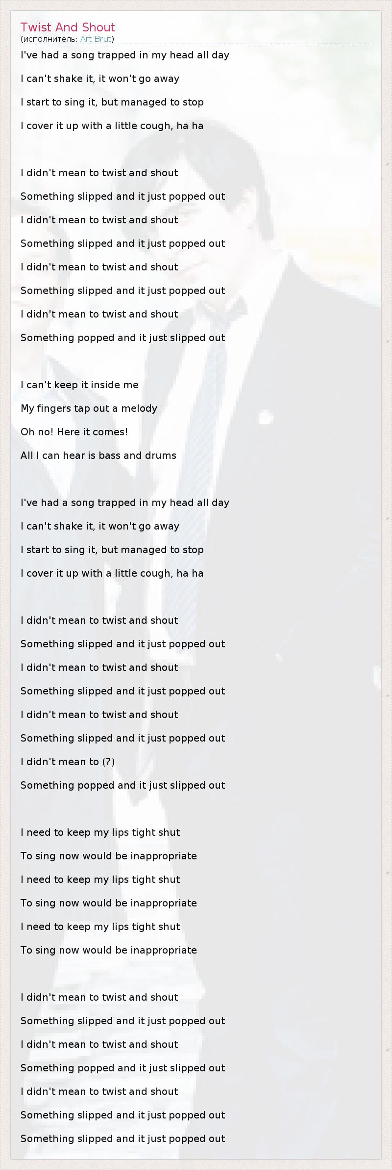 I've had a song trapped in my head all day I can't shake it, it won't go away I start to sing it, but managed to stop I cover it up with a little cough, ha ha I didn't mean to twist and shout Something slipped and it just popped out I didn't mean to twist and shout Something slipped and it just popped out I didn't mean to twist and shout Something slipped and it just popped out I didn't mean to twist and shout Something popped and it just slipped out I can't keep it inside me My fingers tap out a melody Oh no! Here it comes! All I can hear is bass and drums I've had a song trapped in my head all day I can't shake it, it won't go away I start to sing it, but managed to stop I cover it up with a little cough, ha ha I didn't mean to twist and shout Something slipped and it just popped out I didn't mean to twist and shout Something slipped and it just popped out I didn't mean to twist and shout Something slipped and it just popped out I didn't mean to (?) Something popped and it just slipped out I need to keep my lips tight shut To sing now would be inappropriate I need to keep my lips tight shut To sing now would be inappropriate I need to keep my lips tight shut To sing now would be inappropriate I didn't mean to twist and shout Something slipped and it just popped out I didn't mean to twist and shout Something popped and it just slipped out I didn't mean to twist and shout Something slipped and it just popped out Something slipped and it just popped out