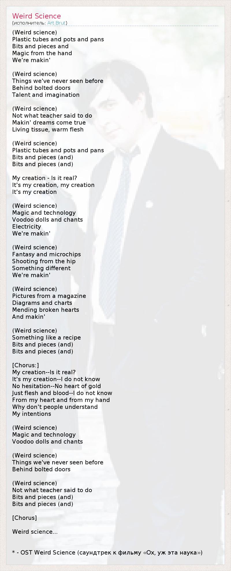 (Weird science) Plastic tubes and pots and pans Bits and pieces and Magic from the hand We're makin' (Weird science) Things we've never seen before Behind bolted doors Talent and imagination (Weird science) Not what teacher said to do Makin' dreams come true Living tissue, warm flesh (Weird science) Plastic tubes and pots and pans Bits and pieces (and) Bits and pieces (and) My creation - Is it real? It's my creation, my creation It's my creation (Weird science) Magic and technology Voodoo dolls and chants Electricity We're makin' (Weird science) Fantasy and microchips Shooting from the hip Something different We're makin' (Weird science) Pictures from a magazine Diagrams and charts Mending broken hearts And makin' (Weird science) Something like a recipe Bits and pieces (and) Bits and pieces (and) [Chorus:] My creation--Is it real? It's my creation--I do not know No hesitation--No heart of gold Just flesh and blood--I do not know From my heart and from my hand Why don't people understand My intentions (Weird science) Magic and technology Voodoo dolls and chants (Weird science) Things we've never seen before Behind bolted doors (Weird science) Not what teacher said to do Bits and pieces (and) Bits and pieces (and) [Chorus] Weird science... * - OST Weird Science (cаундтрек к фильму «Ох, уж эта наука»)