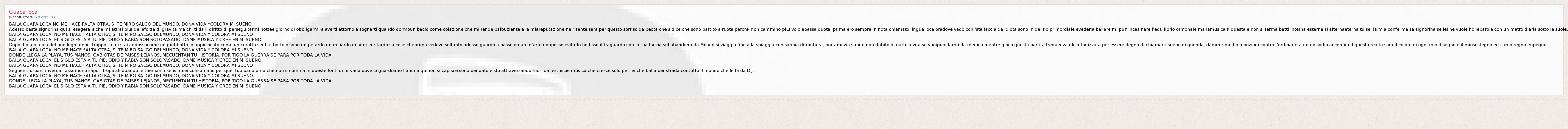 BAILA GUAPA LOCA,NO ME HACE FALTA OTRA, SI TE MIRO SALGO DEL MUNDO, DONA VIDA YCOLORA MI SUENO Adesso basta signorina qui si esagera и che mi attrai piщ dellaforza di gravitа ma chi ti da il diritto di perseguitarmi nottee giorno di obbligarmi a averti attorno a sognarti quando dormoun bacio come colazione che mi rende balbuziente e la miareputazione ne risente sarа per questo sorriso da beota che sidice che sono partito a ruota perchй non cammino piщ volo abassa quota, prima ero sempre in nota chiamato lingua loca oradove vado con 'sta faccia da idiota sono in delirio primordiale evederla ballare mi puт incasinare l'equilibrio ormonale ma lamusica и questa e non si ferma batti interna esterna si alternaeterna tu sei la mia conferma sa signorina se lei ne vuole ho leparole con un metro d'aria sotto le suole. BAILA GUAPA LOCA, NO ME HACE FALTA OTRA, SI TE MIRO SALGO DELMUNDO, DONA VIDA Y COLORA MI SUENO BAILA GUAPA LOCA, EL SIGLO ESTA A TU PIE, ODIO Y RABIA SON SOLOPASADO, DAME MUSICA Y CREE EN MI SUENO Dopo il bla bla bla del non leghiamoci troppo tu mi stai addossocome un giubbotto io appiccicato come un cerotto senti il bottoio sono un petardo un miliardo di anni in ritardo su cose cheprima vedevo soltanto adesso guardo a passo da un infarto nonposso evitarlo ho fisso il traguardo con la tua faccia sullabandiera da Milano si viaggia fino alla spiaggia con sabbia difrontiera, portami via subito non dubito di darti la vita se vuoipuoi farmi da medico mentre gioco questa partita frequenza dksintonizzata per essere degno di chiamarti sueno di guenda, dammirimedio o pozioni contro l'ordinarietа un episodio ai confini diquesta realtа sarа il colore di ogni mio disegno e il miosostegno ed il mio regno impegno BAILA GUAPA LOCA, NO ME HACE FALTA OTRA, SI TE MIRO SALGO DELMUNDO, DONA VIDA Y COLORA MI SUENO DONDE LLEGA LA PLAYA, TUS MANOS, GABIOTAS DE PAISES LEJANOS, MECUENTAN TU HISTORIA, POR TIGO LA GUERRA SE PARA POR TODA LA VIDA BAILA GUAPA LOCA, EL SIGLO ESTA A TU PIE, ODIO Y RABIA SON SOLOPASADO, DAME MUSICA Y CREE EN MI SUENO BAILA GUAPA LOCA, NO ME HACE FALTA OTRA, SI TE MIRO SALGO DELMUNDO, DONA VIDA Y COLORA MI SUENO Seguenti urbani invernali assumono sapori tropicali quando le tuemani i sensi miei consumano per quel tuo panorama che non sinomina in queste fonti di nirvana dove ci guardiamo l'anima quinon si capisce sono bendato e sto attraversando fuori dallestriscie musica che cresce solo per lei che balla per strada contutto il mondo che le fa da D.J. BAILA GUAPA LOCA, NO ME HACE FALTA OTRA, SI TE MIRO SALGO DELMUNDO, DONA VIDA Y COLORA MI SUENO DONDE LLEGA LA PLAYA, TUS MANOS, GABIOTAS DE PAISES LEJANOS, MECUENTAN TU HISTORIA, POR TIGO LA GUERRA SE PARA POR TODA LA VIDA BAILA GUAPA LOCA, EL SIGLO ESTA A TU PIE, ODIO Y RABIA SON SOLOPASADO, DAME MUSICA Y CREE EN MI SUENO