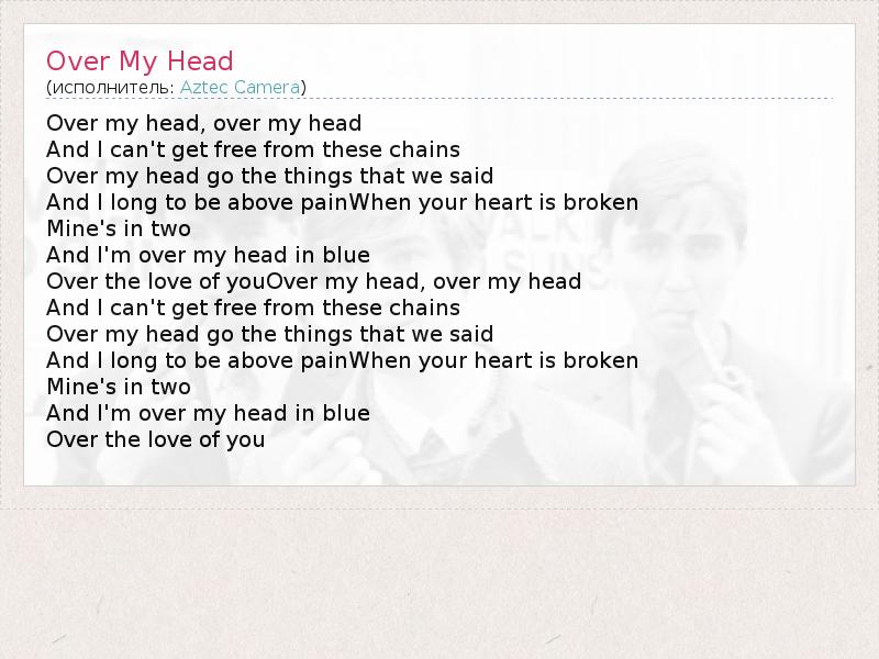 Over my head, over my head And I can't get free from these chains Over my head go the things that we said And I long to be above painWhen your heart is broken Mine's in two And I'm over my head in blue Over the love of youOver my head, over my head And I can't get free from these chains Over my head go the things that we said And I long to be above painWhen your heart is broken Mine's in two And I'm over my head in blue Over the love of you