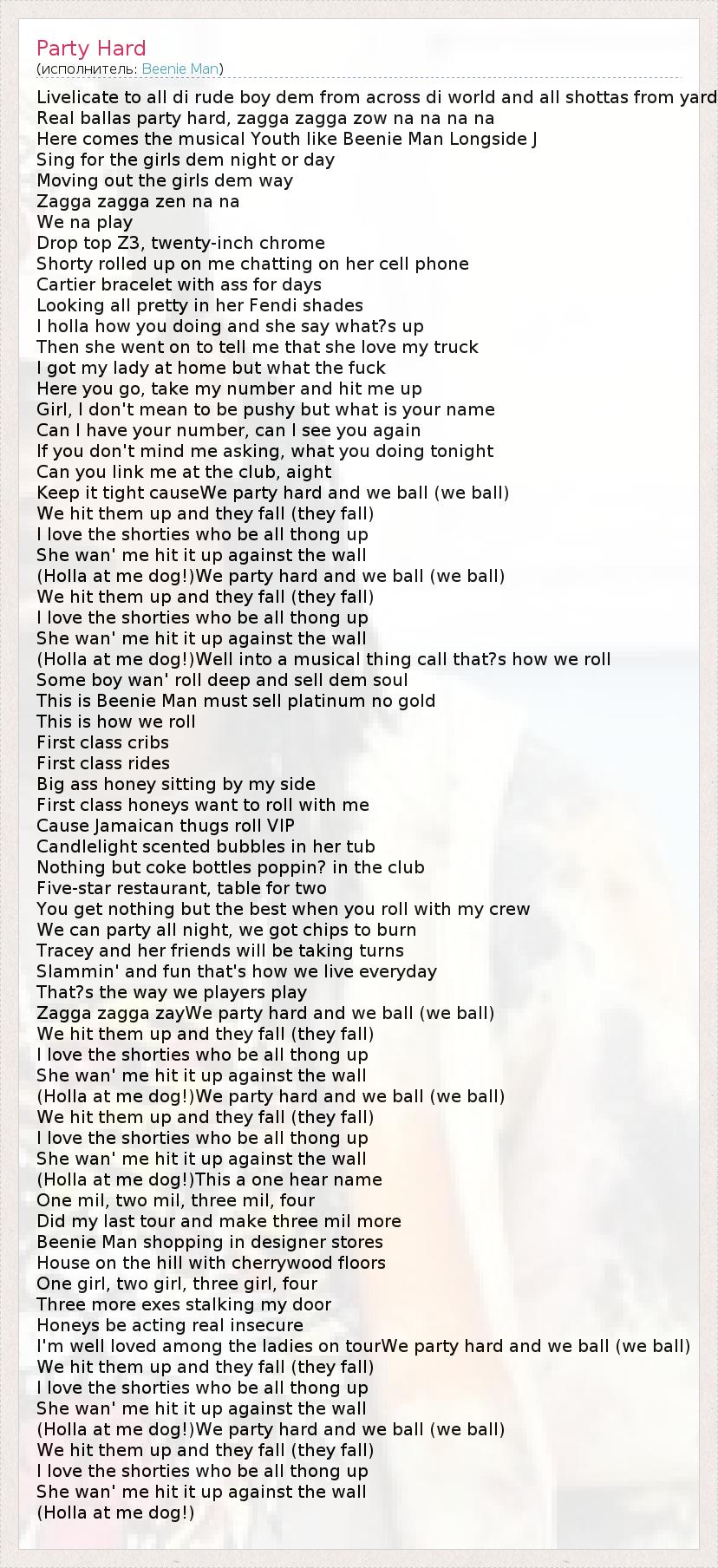 Livelicate to all di rude boy dem from across di world and all shottas from yard Real ballas party hard, zagga zagga zow na na na na Here comes the musical Youth like Beenie Man Longside J Sing for the girls dem night or day Moving out the girls dem way Zagga zagga zen na na We na play Drop top Z3, twenty-inch chrome Shorty rolled up on me chatting on her cell phone Cartier bracelet with ass for days Looking all pretty in her Fendi shades I holla how you doing and she say what?s up Then she went on to tell me that she love my truck I got my lady at home but what the fuck Here you go, take my number and hit me up Girl, I don't mean to be pushy but what is your name Can I have your number, can I see you again If you don't mind me asking, what you doing tonight Can you link me at the club, aight Keep it tight causeWe party hard and we ball (we ball) We hit them up and they fall (they fall) I love the shorties who be all thong up She wan' me hit it up against the wall (Holla at me dog!)We party hard and we ball (we ball) We hit them up and they fall (they fall) I love the shorties who be all thong up She wan' me hit it up against the wall (Holla at me dog!)Well into a musical thing call that?s how we roll Some boy wan' roll deep and sell dem soul This is Beenie Man must sell platinum no gold This is how we roll First class cribs First class rides Big ass honey sitting by my side First class honeys want to roll with me Cause Jamaican thugs roll VIP Candlelight scented bubbles in her tub Nothing but coke bottles poppin? in the club Five-star restaurant, table for two You get nothing but the best when you roll with my crew We can party all night, we got chips to burn Tracey and her friends will be taking turns Slammin' and fun that's how we live everyday That?s the way we players play Zagga zagga zayWe party hard and we ball (we ball) We hit them up and they fall (they fall) I love the shorties who be all thong up She wan' me hit it up against the wall (Holla at me dog!)We party hard and we ball (we ball) We hit them up and they fall (they fall) I love the shorties who be all thong up She wan' me hit it up against the wall (Holla at me dog!)This a one hear name One mil, two mil, three mil, four Did my last tour and make three mil more Beenie Man shopping in designer stores House on the hill with cherrywood floors One girl, two girl, three girl, four Three more exes stalking my door Honeys be acting real insecure I'm well loved among the ladies on tourWe party hard and we ball (we ball) We hit them up and they fall (they fall) I love the shorties who be all thong up She wan' me hit it up against the wall (Holla at me dog!)We party hard and we ball (we ball) We hit them up and they fall (they fall) I love the shorties who be all thong up She wan' me hit it up against the wall (Holla at me dog!)