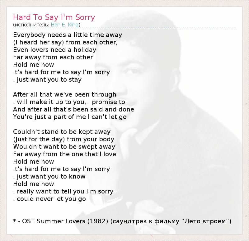 Everybody needs a little time away (I heard her say) from each other, Even lovers need a holiday Far away from each other Hold me now It's hard for me to say I'm sorry I just want you to stay After all that we've been through I will make it up to you, I promise to And after all that's been said and done You're just a part of me I can't let go Couldn't stand to be kept away (Just for the day) from your body Wouldn't want to be swept away Far away from the one that I love Hold me now It's hard for me to say I'm sorry I just want you to know Hold me now I really want to tell you I'm sorry I could never let you go * - OST Summer Lovers (1982) (саундтрек к фильму "Лето втроём")