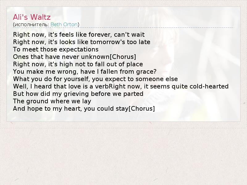 Right now, it's feels like forever, can't wait Right now, it's looks like tomorrow's too late To meet those expectations Ones that have never unknown[Chorus] Right now, it's high not to fall out of place You make me wrong, have I fallen from grace? What you do for yourself, you expect to someone else Well, I heard that love is a verbRight now, it seems quite cold-hearted But how did my grieving before we parted The ground where we lay And hope to my heart, you could stay[Chorus]