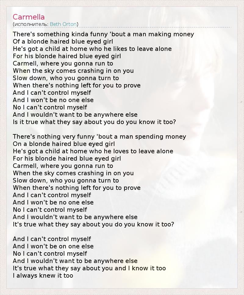 There's something kinda funny 'bout a man making money Of a blonde haired blue eyed girl He's got a child at home who he likes to leave alone For his blonde haired blue eyed girl Carmell, where you gonna run to When the sky comes crashing in on you Slow down, who you gonna turn to When there's nothing left for you to prove And I can't control myself And I won't be no one else No I can't control myself And I wouldn't want to be anywhere else Is it true what they say about you do you know it too? There's nothing very funny 'bout a man spending money On a blonde haired blue eyed girl He's got a child at home who he loves to leave alone For his blonde haired blue eyed girl Carmell, where you gonna run to When the sky comes crashing in on you Slow down, who you gonna turn to When there's nothing left for you to prove And I can't control myself And I won't be no one else No I can't control myself And I wouldn't want to be anywhere else It's true what they say about you do you know it too? And I can't control myself And I won't be on one else No I can't control myself And I wouldn't want to be anywhere else It's true what they say about you and I know it too I always knew it too