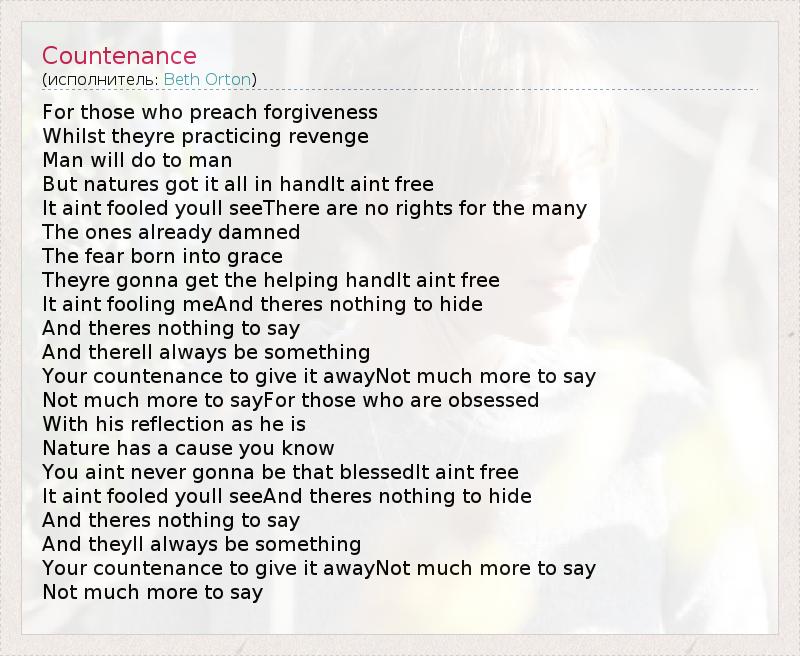 For those who preach forgiveness Whilst theyre practicing revenge Man will do to man But natures got it all in handIt aint free It aint fooled youll seeThere are no rights for the many The ones already damned The fear born into grace Theyre gonna get the helping handIt aint free It aint fooling meAnd theres nothing to hide And theres nothing to say And therell always be something Your countenance to give it awayNot much more to say Not much more to sayFor those who are obsessed With his reflection as he is Nature has a cause you know You aint never gonna be that blessedIt aint free It aint fooled youll seeAnd theres nothing to hide And theres nothing to say And theyll always be something Your countenance to give it awayNot much more to say Not much more to say