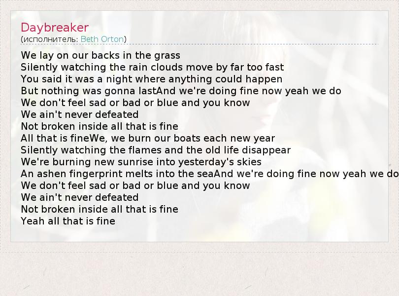 We lay on our backs in the grass Silently watching the rain clouds move by far too fast You said it was a night where anything could happen But nothing was gonna lastAnd we're doing fine now yeah we do We don't feel sad or bad or blue and you know We ain't never defeated Not broken inside all that is fine All that is fineWe, we burn our boats each new year Silently watching the flames and the old life disappear We're burning new sunrise into yesterday's skies An ashen fingerprint melts into the seaAnd we're doing fine now yeah we do We don't feel sad or bad or blue and you know We ain't never defeated Not broken inside all that is fine Yeah all that is fine