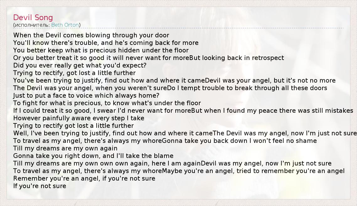 When the Devil comes blowing through your door You'll know there's trouble, and he's coming back for more You better keep what is precious hidden under the floor Or you better treat it so good it will never want for moreBut looking back in retrospect Did you ever really get what you'd expect? Trying to rectify, got lost a little further You've been trying to justify, find out how and where it cameDevil was your angel, but it's not no more The Devil was your angel, when you weren't sureDo I tempt trouble to break through all these doors Just to put a face to voice which always home? To fight for what is precious, to know what's under the floor If I could treat it so good, I swear I'd never want for moreBut when I found my peace there was still mistakes However painfully aware every step I take Trying to rectify got lost a little further Well, I've been trying to justify, find out how and where it cameThe Devil was my angel, now I'm just not sure To travel as my angel, there's always my whoreGonna take you back down I won't feel no shame Till my dreams are my own again Gonna take you right down, and I'll take the blame Till my dreams are my own own own again, here I am againDevil was my angel, now I'm just not sure To travel as my angel, there's always my whoreMaybe you're an angel, tried to remember you're an angel Remember you're an angel, if you're not sure If you're not sure