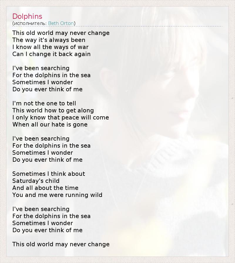 This old world may never change The way it's always been I know all the ways of war Can I change it back again I've been searching For the dolphins in the sea Sometimes I wonder Do you ever think of me I'm not the one to tell This world how to get along I only know that peace will come When all our hate is gone I've been searching For the dolphins in the sea Sometimes I wonder Do you ever think of me Sometimes I think about Saturday's child And all about the time You and me were running wild I've been searching For the dolphins in the sea Sometimes I wonder Do you ever think of me This old world may never change