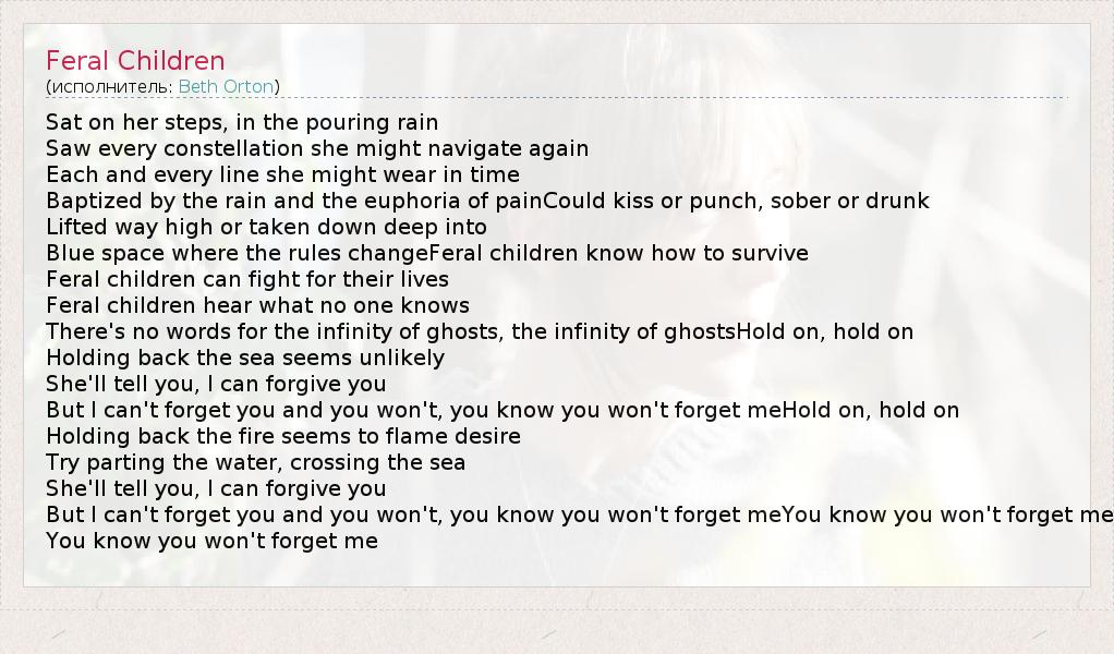 Sat on her steps, in the pouring rain Saw every constellation she might navigate again Each and every line she might wear in time Baptized by the rain and the euphoria of painCould kiss or punch, sober or drunk Lifted way high or taken down deep into Blue space where the rules changeFeral children know how to survive Feral children can fight for their lives Feral children hear what no one knows There's no words for the infinity of ghosts, the infinity of ghostsHold on, hold on Holding back the sea seems unlikely She'll tell you, I can forgive you But I can't forget you and you won't, you know you won't forget meHold on, hold on Holding back the fire seems to flame desire Try parting the water, crossing the sea She'll tell you, I can forgive you But I can't forget you and you won't, you know you won't forget meYou know you won't forget me You know you won't forget me