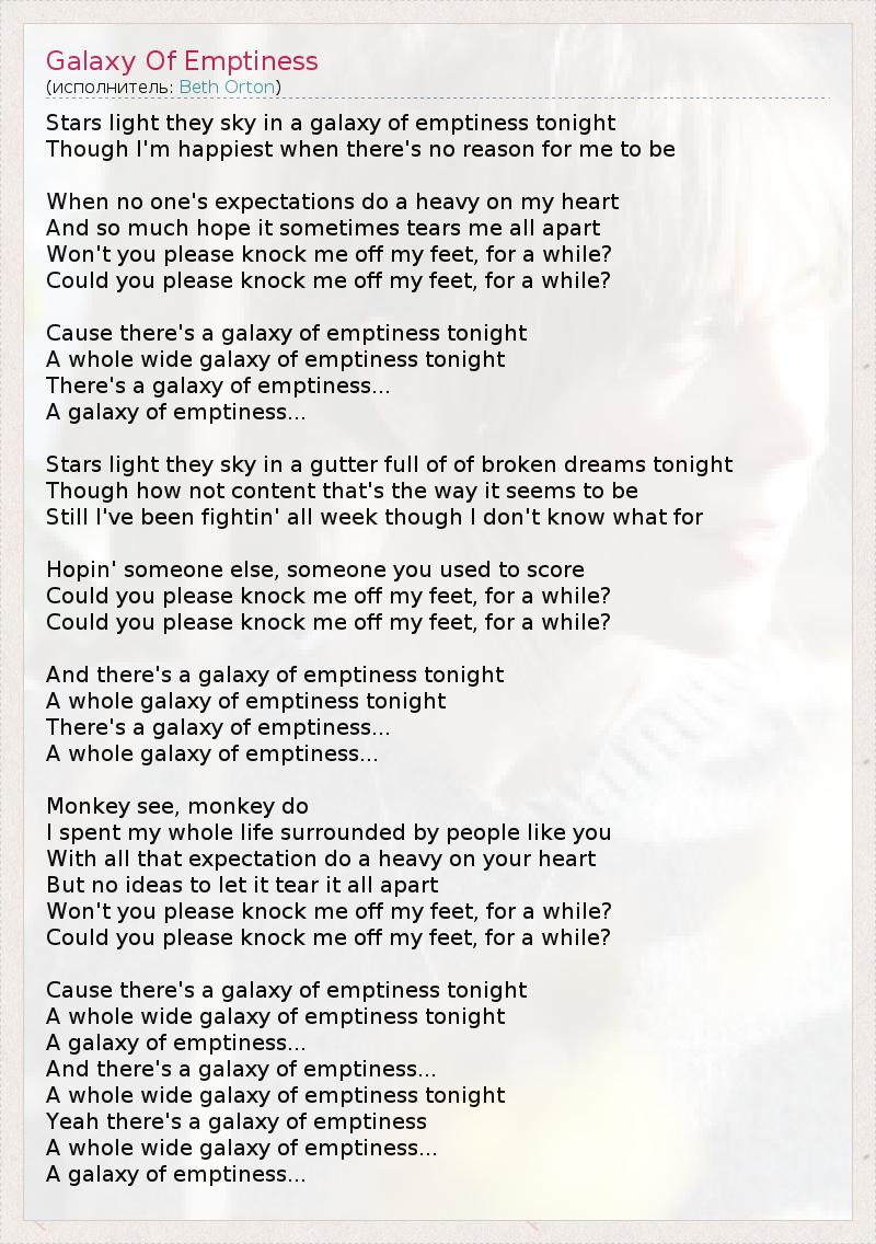 Stars light they sky in a galaxy of emptiness tonight Though I'm happiest when there's no reason for me to be When no one's expectations do a heavy on my heart And so much hope it sometimes tears me all apart Won't you please knock me off my feet, for a while? Could you please knock me off my feet, for a while? Cause there's a galaxy of emptiness tonight A whole wide galaxy of emptiness tonight There's a galaxy of emptiness... A galaxy of emptiness... Stars light they sky in a gutter full of of broken dreams tonight Though how not content that's the way it seems to be Still I've been fightin' all week though I don't know what for Hopin' someone else, someone you used to score Could you please knock me off my feet, for a while? Could you please knock me off my feet, for a while? And there's a galaxy of emptiness tonight A whole galaxy of emptiness tonight There's a galaxy of emptiness... A whole galaxy of emptiness... Monkey see, monkey do I spent my whole life surrounded by people like you With all that expectation do a heavy on your heart But no ideas to let it tear it all apart Won't you please knock me off my feet, for a while? Could you please knock me off my feet, for a while? Cause there's a galaxy of emptiness tonight A whole wide galaxy of emptiness tonight A galaxy of emptiness... And there's a galaxy of emptiness... A whole wide galaxy of emptiness tonight Yeah there's a galaxy of emptiness A whole wide galaxy of emptiness... A galaxy of emptiness...