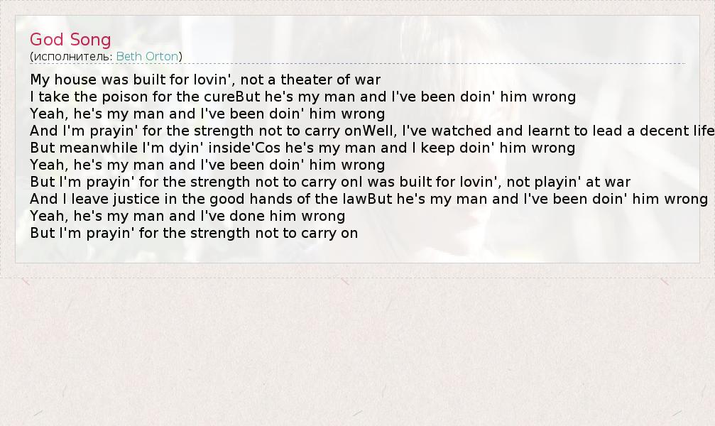 My house was built for lovin', not a theater of war I take the poison for the cureBut he's my man and I've been doin' him wrong Yeah, he's my man and I've been doin' him wrong And I'm prayin' for the strength not to carry onWell, I've watched and learnt to lead a decent life But meanwhile I'm dyin' inside'Cos he's my man and I keep doin' him wrong Yeah, he's my man and I've been doin' him wrong But I'm prayin' for the strength not to carry onI was built for lovin', not playin' at war And I leave justice in the good hands of the lawBut he's my man and I've been doin' him wrong Yeah, he's my man and I've done him wrong But I'm prayin' for the strength not to carry on
