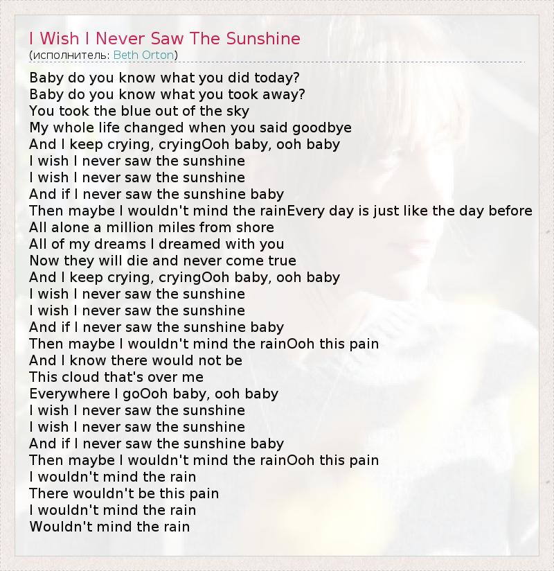 Baby do you know what you did today? Baby do you know what you took away? You took the blue out of the sky My whole life changed when you said goodbye And I keep crying, cryingOoh baby, ooh baby I wish I never saw the sunshine I wish I never saw the sunshine And if I never saw the sunshine baby Then maybe I wouldn't mind the rainEvery day is just like the day before All alone a million miles from shore All of my dreams I dreamed with you Now they will die and never come true And I keep crying, cryingOoh baby, ooh baby I wish I never saw the sunshine I wish I never saw the sunshine And if I never saw the sunshine baby Then maybe I wouldn't mind the rainOoh this pain And I know there would not be This cloud that's over me Everywhere I goOoh baby, ooh baby I wish I never saw the sunshine I wish I never saw the sunshine And if I never saw the sunshine baby Then maybe I wouldn't mind the rainOoh this pain I wouldn't mind the rain There wouldn't be this pain I wouldn't mind the rain Wouldn't mind the rain