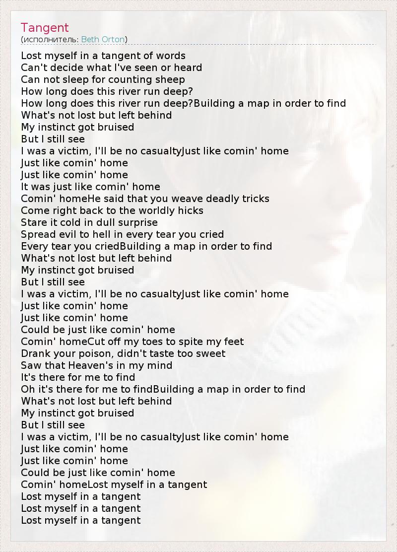 Lost myself in a tangent of words Can't decide what I've seen or heard Can not sleep for counting sheep How long does this river run deep? How long does this river run deep?Building a map in order to find What's not lost but left behind My instinct got bruised But I still see I was a victim, I'll be no casualtyJust like comin' home Just like comin' home Just like comin' home It was just like comin' home Comin' homeHe said that you weave deadly tricks Come right back to the worldly hicks Stare it cold in dull surprise Spread evil to hell in every tear you cried Every tear you criedBuilding a map in order to find What's not lost but left behind My instinct got bruised But I still see I was a victim, I'll be no casualtyJust like comin' home Just like comin' home Just like comin' home Could be just like comin' home Comin' homeCut off my toes to spite my feet Drank your poison, didn't taste too sweet Saw that Heaven's in my mind It's there for me to find Oh it's there for me to findBuilding a map in order to find What's not lost but left behind My instinct got bruised But I still see I was a victim, I'll be no casualtyJust like comin' home Just like comin' home Just like comin' home Could be just like comin' home Comin' homeLost myself in a tangent Lost myself in a tangent Lost myself in a tangent Lost myself in a tangent