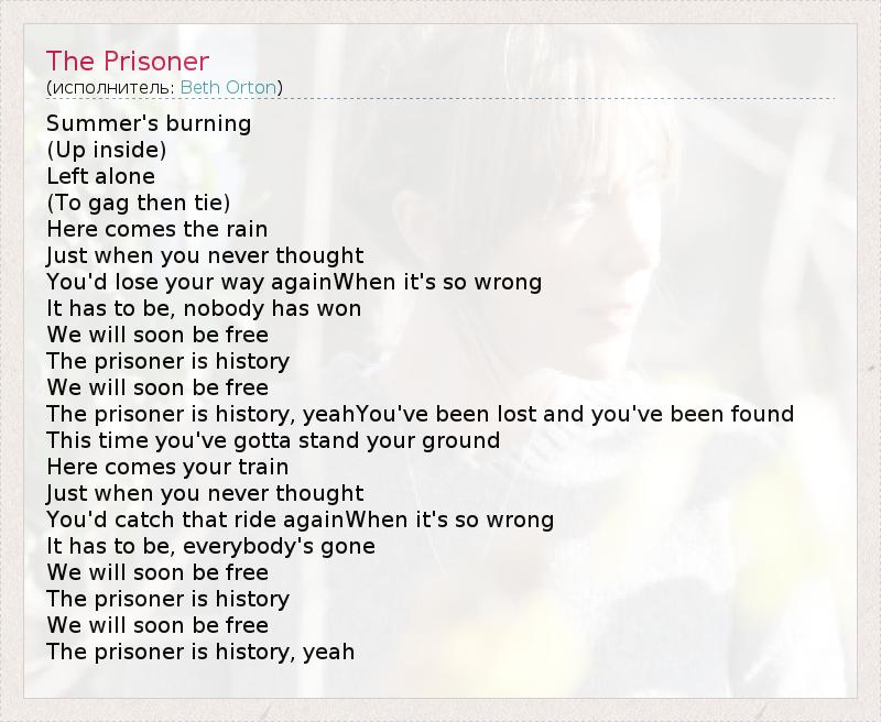 Summer's burning (Up inside) Left alone (To gag then tie) Here comes the rain Just when you never thought You'd lose your way againWhen it's so wrong It has to be, nobody has won We will soon be free The prisoner is history We will soon be free The prisoner is history, yeahYou've been lost and you've been found This time you've gotta stand your ground Here comes your train Just when you never thought You'd catch that ride againWhen it's so wrong It has to be, everybody's gone We will soon be free The prisoner is history We will soon be free The prisoner is history, yeah