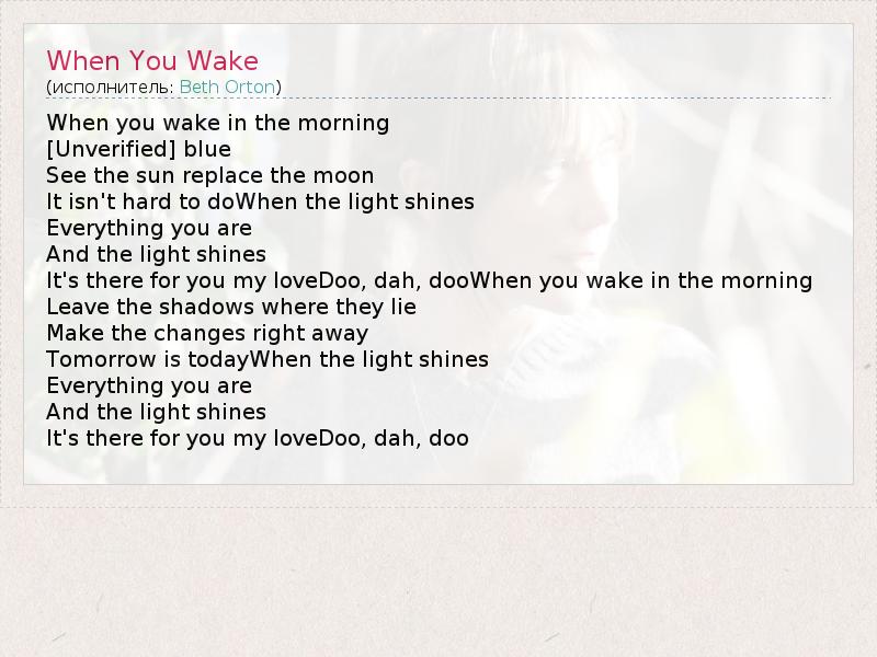 When you wake in the morning [Unverified] blue See the sun replace the moon It isn't hard to doWhen the light shines Everything you are And the light shines It's there for you my loveDoo, dah, dooWhen you wake in the morning Leave the shadows where they lie Make the changes right away Tomorrow is todayWhen the light shines Everything you are And the light shines It's there for you my loveDoo, dah, doo