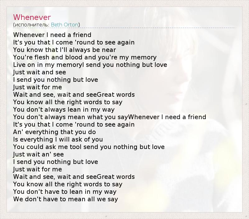 Whenever I need a friend It's you that I come 'round to see again You know that I'll always be near You're flesh and blood and you're my memory Live on in my memoryI send you nothing but love Just wait and see I send you nothing but love Just wait for me Wait and see, wait and seeGreat words You know all the right words to say You don't always lean in my way You don't always mean what you sayWhenever I need a friend It's you that I come 'round to see again An' everything that you do Is everything I will ask of you You could ask me tooI send you nothing but love Just wait an' see I send you nothing but love Just wait for me Wait and see, wait and seeGreat words You know all the right words to say You don't have to lean in my way We don't have to mean all we say