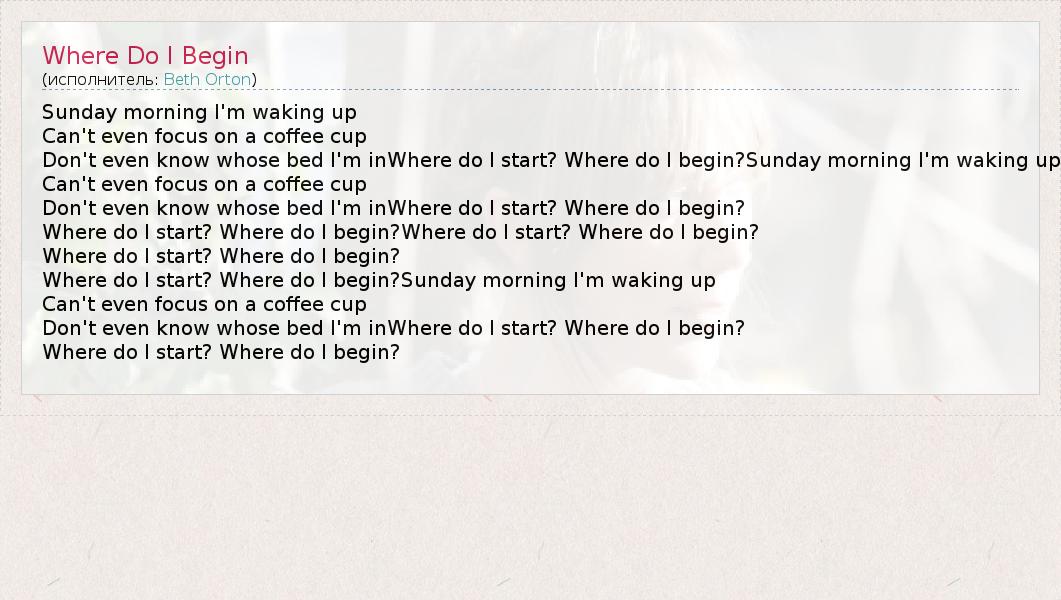 Sunday morning I'm waking up Can't even focus on a coffee cup Don't even know whose bed I'm inWhere do I start? Where do I begin?Sunday morning I'm waking up Can't even focus on a coffee cup Don't even know whose bed I'm inWhere do I start? Where do I begin? Where do I start? Where do I begin?Where do I start? Where do I begin? Where do I start? Where do I begin? Where do I start? Where do I begin?Sunday morning I'm waking up Can't even focus on a coffee cup Don't even know whose bed I'm inWhere do I start? Where do I begin? Where do I start? Where do I begin?