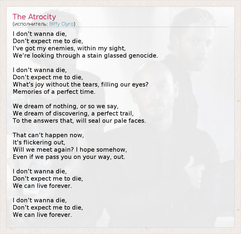 I don't wanna die, Don't expect me to die, I've got my enemies, within my sight, We're looking through a stain glassed genocide. I don't wanna die, Don't expect me to die, What's joy without the tears, filling our eyes? Memories of a perfect time. We dream of nothing, or so we say, We dream of discovering, a perfect trail, To the answers that, will seal our pale faces. That can't happen now, It's flickering out, Will we meet again? I hope somehow, Even if we pass you on your way, out. I don't wanna die, Don't expect me to die, We can live forever. I don't wanna die, Don't expect me to die, We can live forever.
