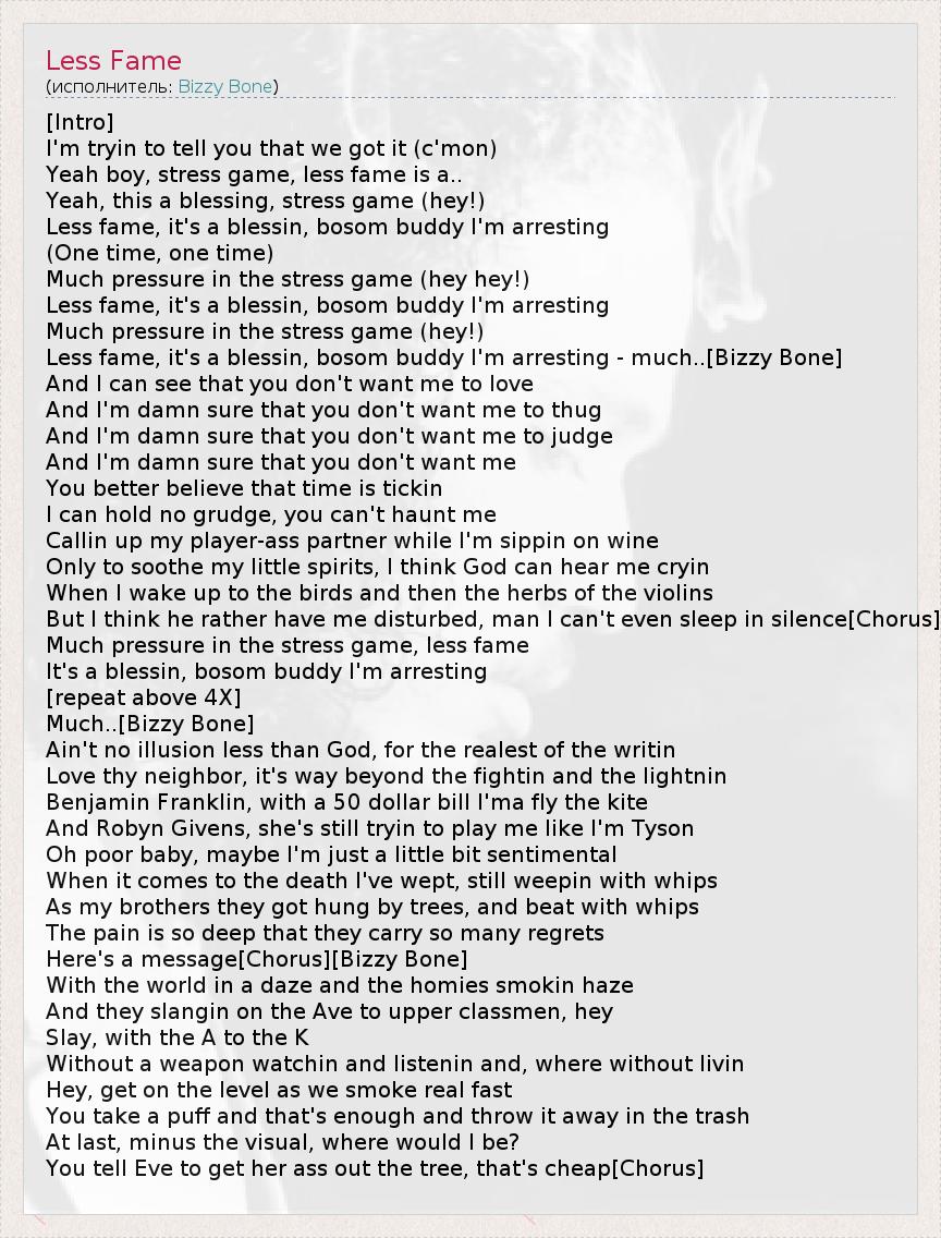 [Intro] I'm tryin to tell you that we got it (c'mon) Yeah boy, stress game, less fame is a.. Yeah, this a blessing, stress game (hey!) Less fame, it's a blessin, bosom buddy I'm arresting (One time, one time) Much pressure in the stress game (hey hey!) Less fame, it's a blessin, bosom buddy I'm arresting Much pressure in the stress game (hey!) Less fame, it's a blessin, bosom buddy I'm arresting - much..[Bizzy Bone] And I can see that you don't want me to love And I'm damn sure that you don't want me to thug And I'm damn sure that you don't want me to judge And I'm damn sure that you don't want me You better believe that time is tickin I can hold no grudge, you can't haunt me Callin up my player-ass partner while I'm sippin on wine Only to soothe my little spirits, I think God can hear me cryin When I wake up to the birds and then the herbs of the violins But I think he rather have me disturbed, man I can't even sleep in silence[Chorus] Much pressure in the stress game, less fame It's a blessin, bosom buddy I'm arresting [repeat above 4X] Much..[Bizzy Bone] Ain't no illusion less than God, for the realest of the writin Love thy neighbor, it's way beyond the fightin and the lightnin Benjamin Franklin, with a 50 dollar bill I'ma fly the kite And Robyn Givens, she's still tryin to play me like I'm Tyson Oh poor baby, maybe I'm just a little bit sentimental When it comes to the death I've wept, still weepin with whips As my brothers they got hung by trees, and beat with whips The pain is so deep that they carry so many regrets Here's a message[Chorus][Bizzy Bone] With the world in a daze and the homies smokin haze And they slangin on the Ave to upper classmen, hey Slay, with the A to the K Without a weapon watchin and listenin and, where without livin Hey, get on the level as we smoke real fast You take a puff and that's enough and throw it away in the trash At last, minus the visual, where would I be? You tell Eve to get her ass out the tree, that's cheap[Chorus]