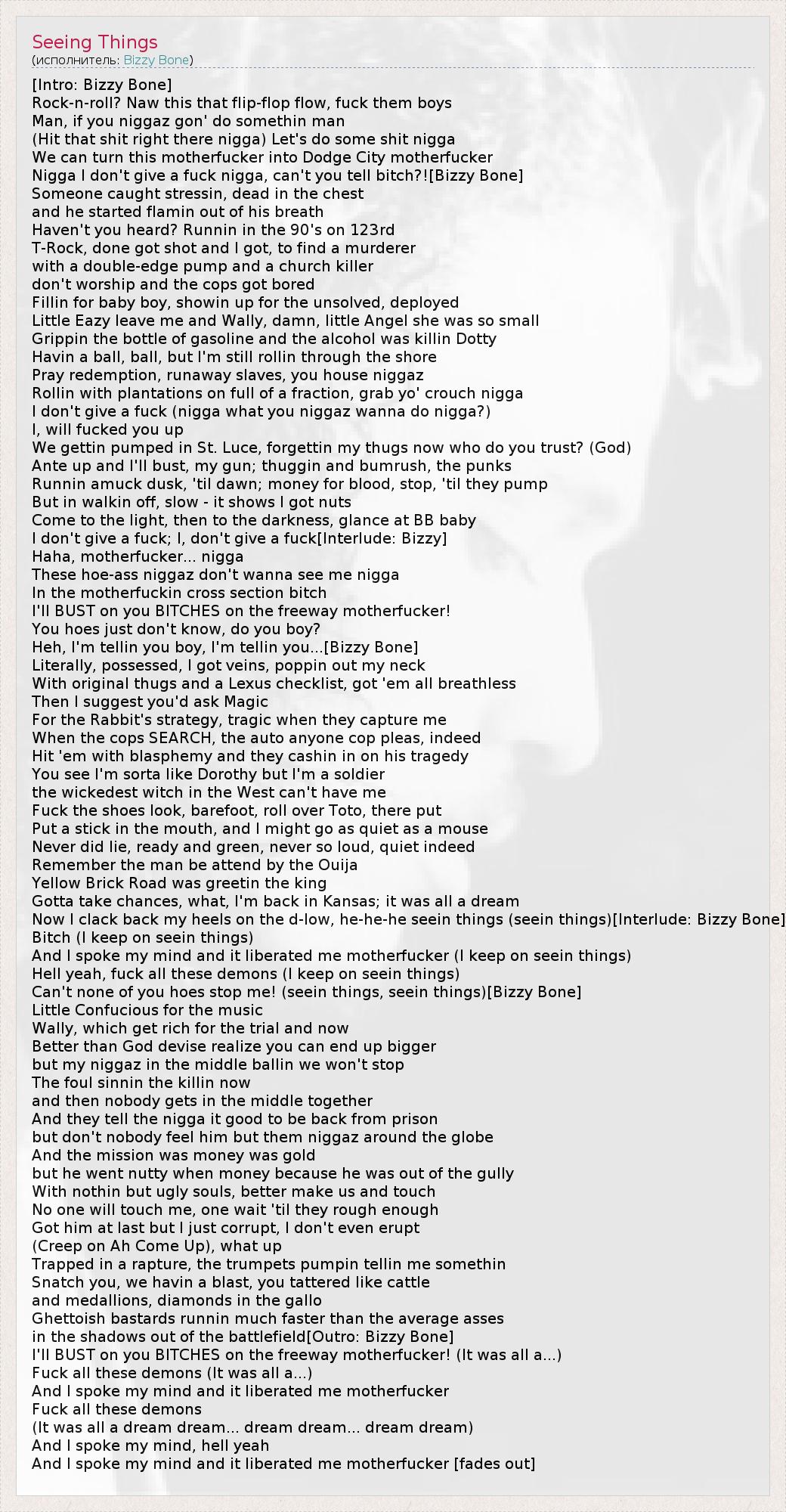 [Intro: Bizzy Bone] Rock-n-roll? Naw this that flip-flop flow, fuck them boys Man, if you niggaz gon' do somethin man (Hit that shit right there nigga) Let's do some shit nigga We can turn this motherfucker into Dodge City motherfucker Nigga I don't give a fuck nigga, can't you tell bitch?![Bizzy Bone] Someone caught stressin, dead in the chest and he started flamin out of his breath Haven't you heard? Runnin in the 90's on 123rd T-Rock, done got shot and I got, to find a murderer with a double-edge pump and a church killer don't worship and the cops got bored Fillin for baby boy, showin up for the unsolved, deployed Little Eazy leave me and Wally, damn, little Angel she was so small Grippin the bottle of gasoline and the alcohol was killin Dotty Havin a ball, ball, but I'm still rollin through the shore Pray redemption, runaway slaves, you house niggaz Rollin with plantations on full of a fraction, grab yo' crouch nigga I don't give a fuck (nigga what you niggaz wanna do nigga?) I, will fucked you up We gettin pumped in St. Luce, forgettin my thugs now who do you trust? (God) Ante up and I'll bust, my gun; thuggin and bumrush, the punks Runnin amuck dusk, 'til dawn; money for blood, stop, 'til they pump But in walkin off, slow - it shows I got nuts Come to the light, then to the darkness, glance at BB baby I don't give a fuck; I, don't give a fuck[Interlude: Bizzy] Haha, motherfucker... nigga These hoe-ass niggaz don't wanna see me nigga In the motherfuckin cross section bitch I'll BUST on you BITCHES on the freeway motherfucker! You hoes just don't know, do you boy? Heh, I'm tellin you boy, I'm tellin you...[Bizzy Bone] Literally, possessed, I got veins, poppin out my neck With original thugs and a Lexus checklist, got 'em all breathless Then I suggest you'd ask Magic For the Rabbit's strategy, tragic when they capture me When the cops SEARCH, the auto anyone cop pleas, indeed Hit 'em with blasphemy and they cashin in on his tragedy You see I'm sorta like Dorothy but I'm a soldier the wickedest witch in the West can't have me Fuck the shoes look, barefoot, roll over Toto, there put Put a stick in the mouth, and I might go as quiet as a mouse Never did lie, ready and green, never so loud, quiet indeed Remember the man be attend by the Ouija Yellow Brick Road was greetin the king Gotta take chances, what, I'm back in Kansas; it was all a dream Now I clack back my heels on the d-low, he-he-he seein things (seein things)[Interlude: Bizzy Bone] Bitch (I keep on seein things) And I spoke my mind and it liberated me motherfucker (I keep on seein things) Hell yeah, fuck all these demons (I keep on seein things) Can't none of you hoes stop me! (seein things, seein things)[Bizzy Bone] Little Confucious for the music Wally, which get rich for the trial and now Better than God devise realize you can end up bigger but my niggaz in the middle ballin we won't stop The foul sinnin the killin now and then nobody gets in the middle together And they tell the nigga it good to be back from prison but don't nobody feel him but them niggaz around the globe And the mission was money was gold but he went nutty when money because he was out of the gully With nothin but ugly souls, better make us and touch No one will touch me, one wait 'til they rough enough Got him at last but I just corrupt, I don't even erupt (Creep on Ah Come Up), what up Trapped in a rapture, the trumpets pumpin tellin me somethin Snatch you, we havin a blast, you tattered like cattle and medallions, diamonds in the gallo Ghettoish bastards runnin much faster than the average asses in the shadows out of the battlefield[Outro: Bizzy Bone] I'll BUST on you BITCHES on the freeway motherfucker! (It was all a...) Fuck all these demons (It was all a...) And I spoke my mind and it liberated me motherfucker Fuck all these demons (It was all a dream dream... dream dream... dream dream) And I spoke my mind, hell yeah And I spoke my mind and it liberated me motherfucker [fades out]