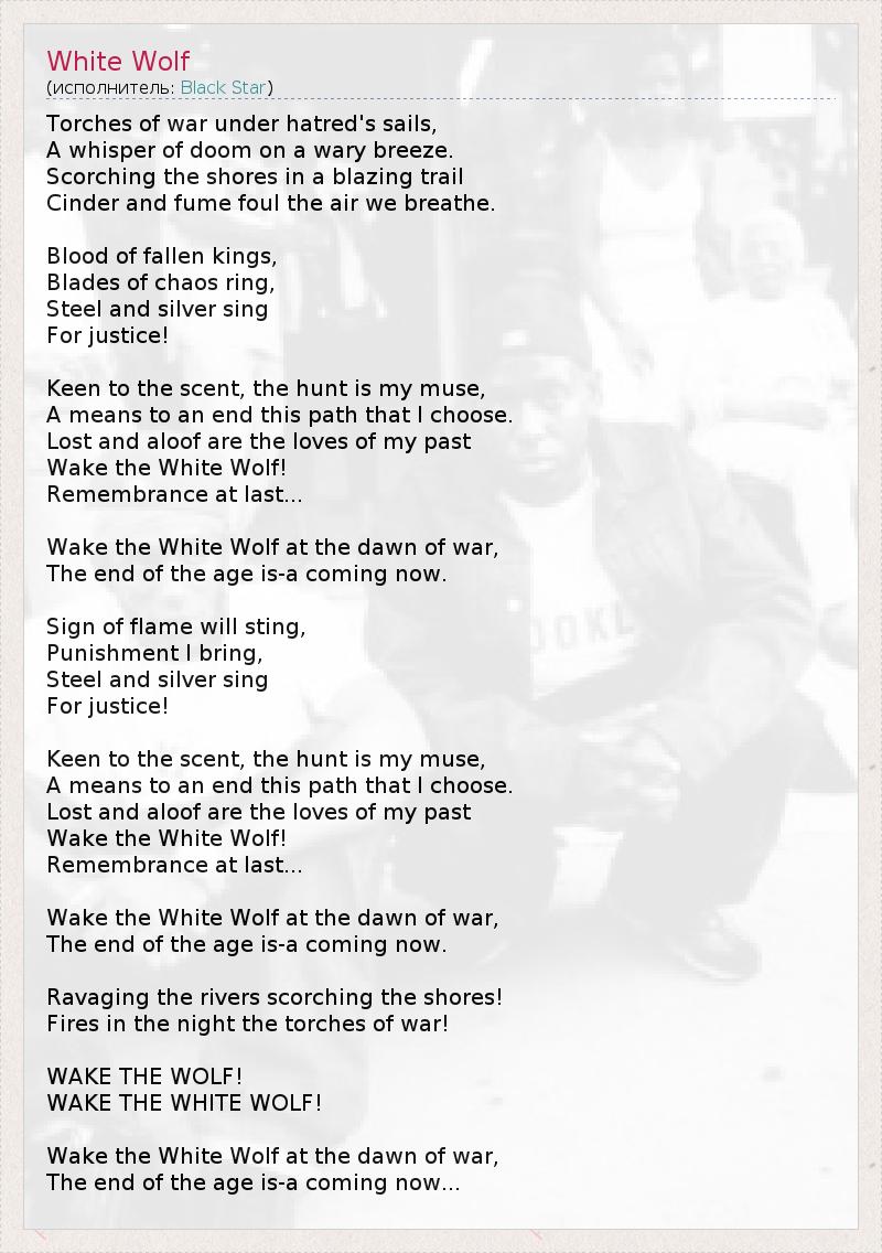 Отсветы войны под парусами ненависти, Шёпот рока на лёгком ветру. Пылающие берега огненной тропы Пеплом и дымом оскверняют вдыхаемый нами воздух. Кровь павших королей, Безумный танец клинков, Песнь стали и серебра Во имя справедливости! Чёткий след, охота вдохновляет меня Пройти до конца по выбранному мной пути. Любимые в прошлом, давно потеряны, Проснись, Белый Волк! Вспомни наконец... Разбудите Белого Волка, война на пороге, Конец эпохи грядёт. Огненный знак обожжёт, Возмездие несу я, Песнь стали и серебра Во имя справедливости! Чёткий след, охота вдохновляет меня Пройти до конца по выбранному мной пути. Любимые в прошлом, давно потеряны, Проснись, Белый Волк! Вспомни наконец... Разбудите Белого Волка, война на пороге, Конец эпохи грядёт. Обжигаю берега бушующих рек! Огни в ночи - отсветы войны! Разбудите Волка! Разбудите Белого Волка! Разбудите Белого Волка, война на пороге, Конец эпохи грядёт.