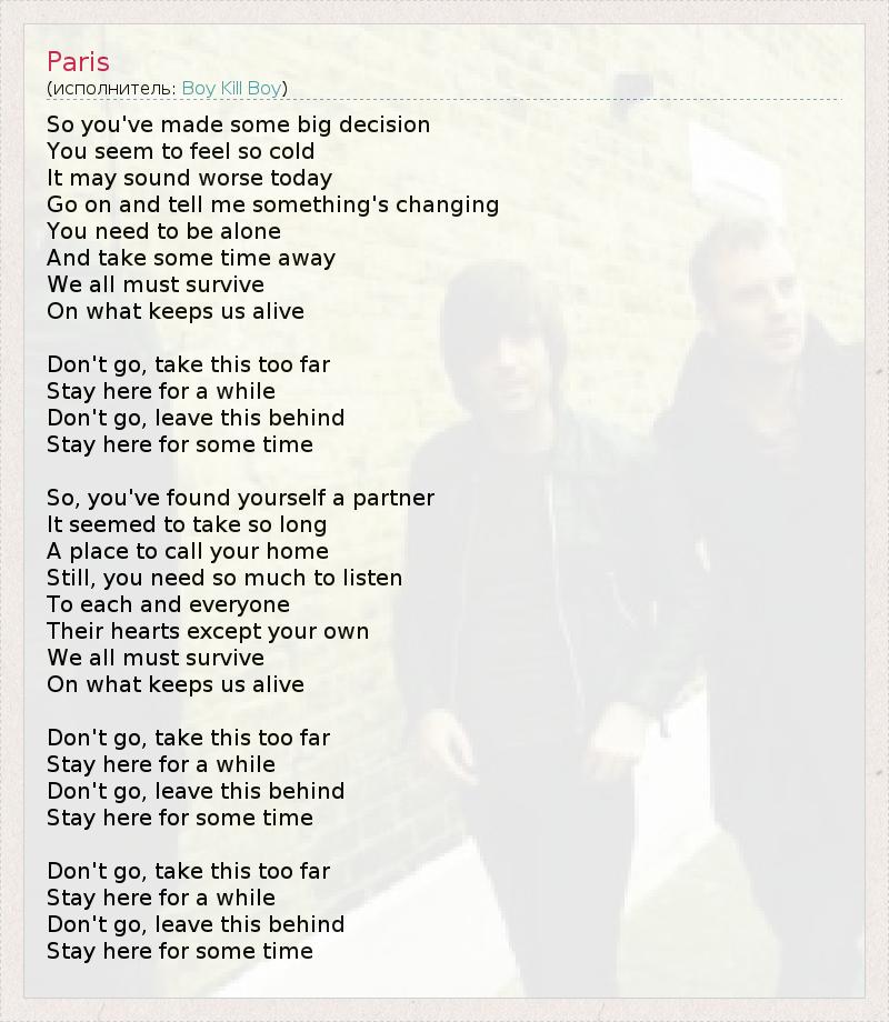 Итак, ты принял очень важное решение Тебе, кажется, так холодно Сегодня, возможно, это звучит хуже Иди и скажи мне, что-то меняется Тебе нужно побыть одному Потрать время Все мы должны выжить Что-то хранит нас Не уходи, убери это подальше Останься на время Не уходи, оставь это в прошлом Останься на время Итак, ты нашёл себе партнёра Кажется, это надолго Место позвонить тебе домой Ещё, тебе нужно так много услышать От всякого и каждого От их сердец, кроме твоего собственного Все мы должны выжить Что-то хранит нас Не уходи, убери это подальше Останься на время Не уходи, оставь это в прошлом Останься на время Не уходи, убери это подальше Останься на время Не уходи, оставь это в прошлом Останься на время