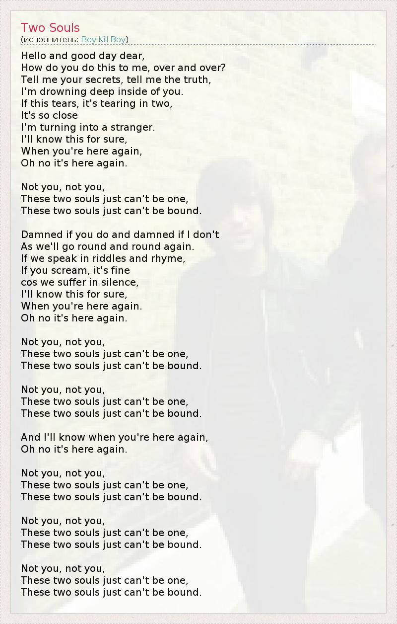 Привет и добрый день дорогая, Как дела, это мне, снова и снова? Расскажи мне свои секреты, скажи мне правду, Я погружаюсь в тебя Если это разрывает, это разрывает на двое, Так близко, Я становлюсь чужим, Я узнаю это наверняка, Когда ты будешь здесь снова, О, нет, это снова здесь Не ты, не ты, Эти две души просто не могут быть одним целым, Эти две души просто не могут быть связаны Проклят, если ты сделаешь, проклят, если я не сделаю Так мы будем ходить кругами Если мы говорим загадками и рифмами, Если ты кричишь, то это красиво Потому что мы страдаем в тишине, Я узнаю это наверняка, Когда ты будешь здесь снова, О, нет, это снова здесь Не ты, не ты, Эти две души просто не могут быть одним целым, Эти две души просто не могут быть связаны Не ты, не ты, Эти две души просто не могут быть одним целым, Эти две души просто не могут быть связаны Я узнаю, когда ты будешь здесь снова, О, нет, это снова здесь Не ты, не ты, Эти две души просто не могут быть одним целым, Эти две души просто не могут быть связаны Не ты, не ты, Эти две души просто не могут быть одним целым, Эти две души просто не могут быть связаны Не ты, не ты, Эти две души просто не могут быть одним целым, Эти две души просто не могут быть связаны