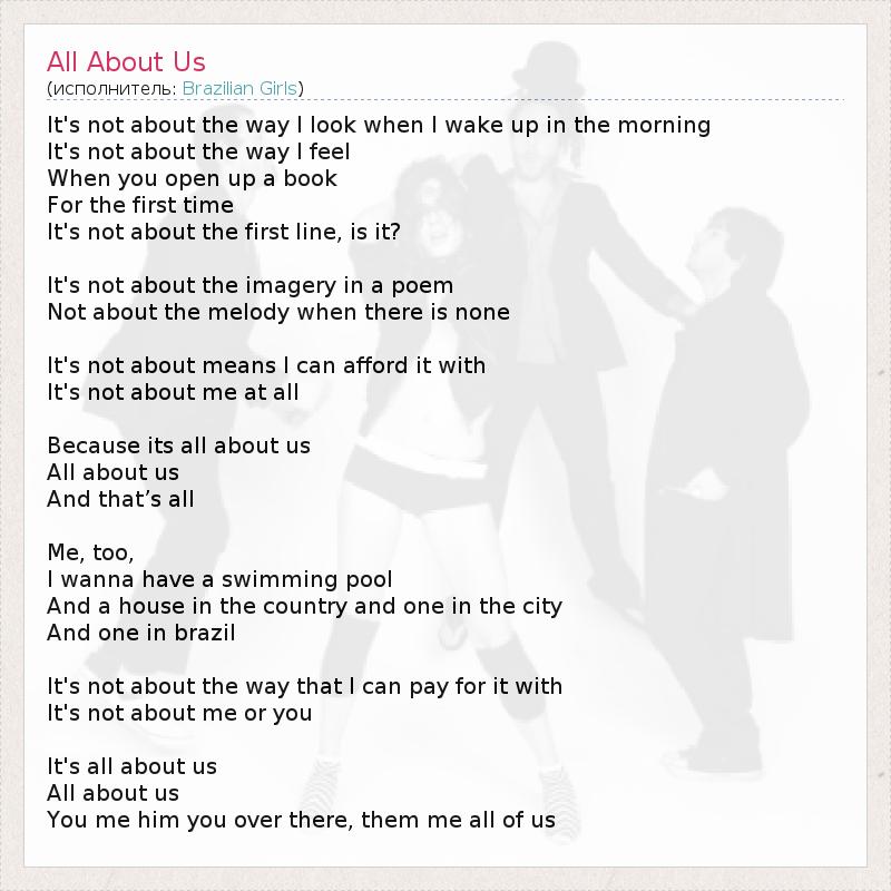 It's not about the way I look when I wake up in the morning It's not about the way I feel When you open up a book For the first time It's not about the first line, is it? It's not about the imagery in a poem Not about the melody when there is none It's not about means I can afford it with It's not about me at all Because its all about us All about us And that’s all Me, too, I wanna have a swimming pool And a house in the country and one in the city And one in brazil It's not about the way that I can pay for it with It's not about me or you It's all about us All about us You me him you over there, them me all of us