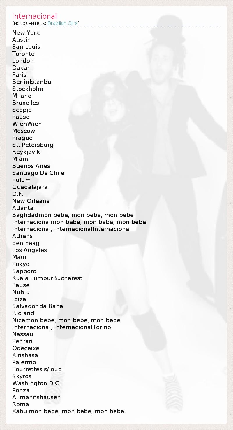 Это интересно:Вам когда-нибудь доводилось испытывать странное ощущение, будто вы находитесь в нескольких точках мира одновременно? Тринидад или Токио, Манхэттен или Милан, Бразилия или Багамы? Если нет, то Brazilian Girls подарят вам это чувство. Как говорит очаровательная вокалистка (единственная девушка в группе) Сабина, встреча с тремя другими участниками группы была похожа на "любовь с первого... продолжение