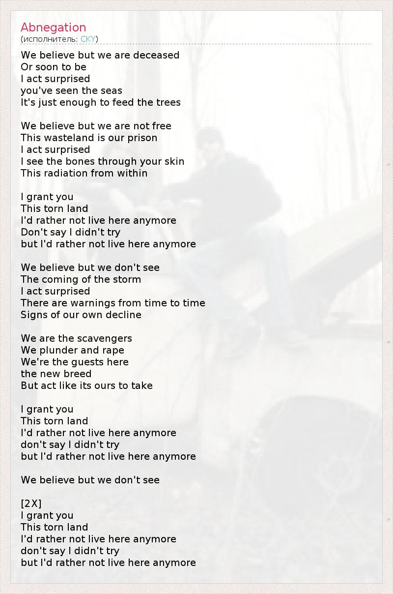 We believe but we are deceased Or soon to be I act surprised you've seen the seas It's just enough to feed the trees We believe but we are not free This wasteland is our prison I act surprised I see the bones through your skin This radiation from within I grant you This torn land I'd rather not live here anymore Don't say I didn't try but I'd rather not live here anymore We believe but we don't see The coming of the storm I act surprised There are warnings from time to time Signs of our own decline We are the scavengers We plunder and rape We're the guests here the new breed But act like its ours to take I grant you This torn land I'd rather not live here anymore don't say I didn't try but I'd rather not live here anymore We believe but we don't see [2X] I grant you This torn land I'd rather not live here anymore don't say I didn't try but I'd rather not live here anymore