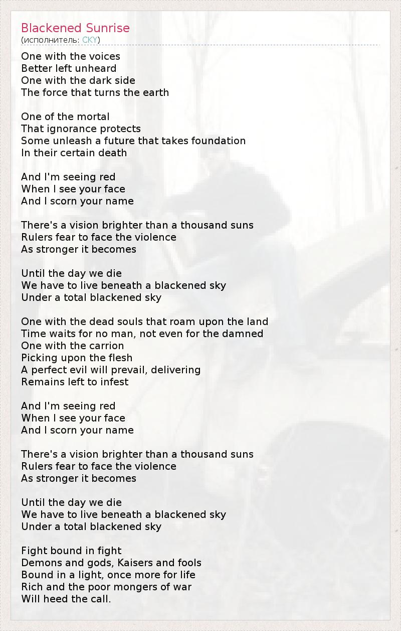 One with the voices Better left unheard One with the dark side The force that turns the earth One of the mortal That ignorance protects Some unleash a future that takes foundation In their certain death And I'm seeing red When I see your face And I scorn your name There's a vision brighter than a thousand suns Rulers fear to face the violence As stronger it becomes Until the day we die We have to live beneath a blackened sky Under a total blackened sky One with the dead souls that roam upon the land Time waits for no man, not even for the damned One with the carrion Picking upon the flesh A perfect evil will prevail, delivering Remains left to infest And I'm seeing red When I see your face And I scorn your name There's a vision brighter than a thousand suns Rulers fear to face the violence As stronger it becomes Until the day we die We have to live beneath a blackened sky Under a total blackened sky Fight bound in fight Demons and gods, Kaisers and fools Bound in a light, once more for life Rich and the poor mongers of war Will heed the call.