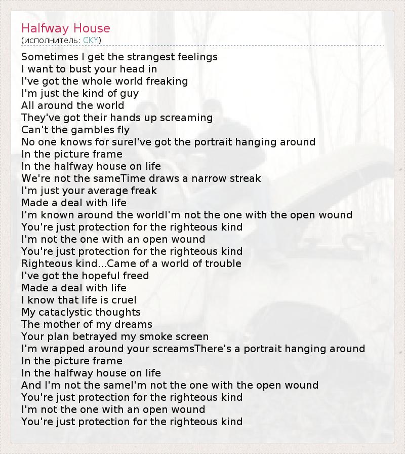 Sometimes I get the strangest feelings I want to bust your head in I've got the whole world freaking I'm just the kind of guy All around the world They've got their hands up screaming Can't the gambles fly No one knows for sureI've got the portrait hanging around In the picture frame In the halfway house on life We're not the sameTime draws a narrow streak I'm just your average freak Made a deal with life I'm known around the worldI'm not the one with the open wound You're just protection for the righteous kind I'm not the one with an open wound You're just protection for the righteous kind Righteous kind...Came of a world of trouble I've got the hopeful freed Made a deal with life I know that life is cruel My cataclystic thoughts The mother of my dreams Your plan betrayed my smoke screen I'm wrapped around your screamsThere's a portrait hanging around In the picture frame In the halfway house on life And I'm not the sameI'm not the one with the open wound You're just protection for the righteous kind I'm not the one with an open wound You're just protection for the righteous kind