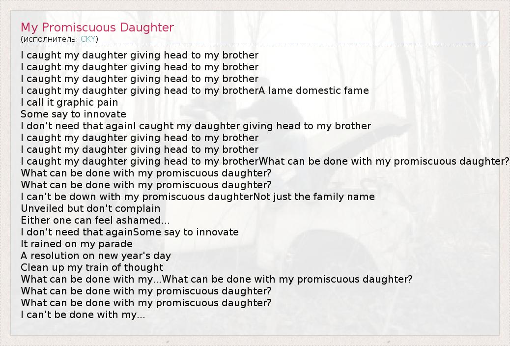 I caught my daughter giving head to my brother I caught my daughter giving head to my brother I caught my daughter giving head to my brother I caught my daughter giving head to my brotherA lame domestic fame I call it graphic pain Some say to innovate I don't need that againI caught my daughter giving head to my brother I caught my daughter giving head to my brother I caught my daughter giving head to my brother I caught my daughter giving head to my brotherWhat can be done with my promiscuous daughter? What can be done with my promiscuous daughter? What can be done with my promiscuous daughter? I can't be down with my promiscuous daughterNot just the family name Unveiled but don't complain Either one can feel ashamed... I don't need that againSome say to innovate It rained on my parade A resolution on new year's day Clean up my train of thought What can be done with my...What can be done with my promiscuous daughter? What can be done with my promiscuous daughter? What can be done with my promiscuous daughter? I can't be done with my...