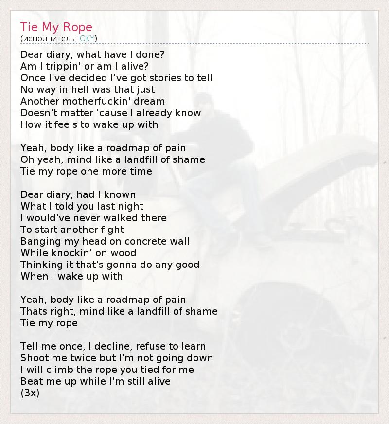 Дорогой дневник, что я наделал? У меня галлюцинации или я жив? Однажды я решил, что могу немало рассказать, Нет пути в ад, было ли это Очередным гребаным сном? Плевать, потому что я уже знаю, Какие ощущения доставляет пробуждение с… Да, с телом, словно дорожная карта боли, О, да, мыслями, словно свалка стыда, Затяни мою верёвку ещё раз… Дорогой дневник, мог ли я знать, Что прошлой ночью рассказал тебе? Я никогда бы не пошёл туда, Чтобы начать очередную битву. Бьюсь головой о бетонную стену, Стуча по дереву, Думая, что это принесёт какую-либо пользу, Когда я проснусь с… Да, с телом, словно дорожная карта боли, О, да, мыслями, словно свалка стыда, Затяни мою верёвку ещё раз… Скажи мне один раз, я опускаюсь, отказываюсь обучаться. Выстрели дважды, но я не упаду, Я взберусь по верёвке, которую ты завязал для меня, Избей меня, пока я ещё жив! (3 раза)