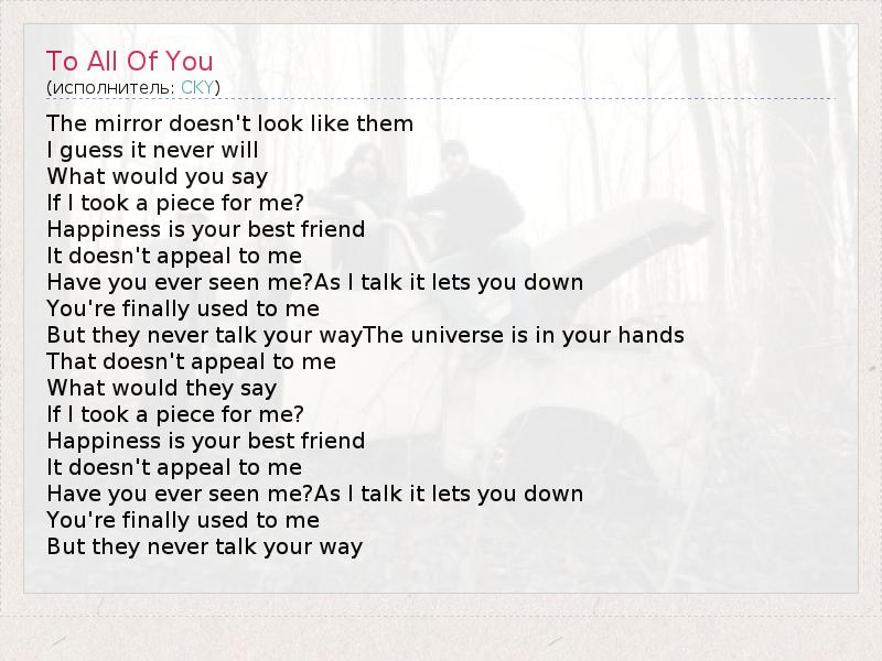 The mirror doesn't look like them I guess it never will What would you say If I took a piece for me? Happiness is your best friend It doesn't appeal to me Have you ever seen me?As I talk it lets you down You're finally used to me But they never talk your wayThe universe is in your hands That doesn't appeal to me What would they say If I took a piece for me? Happiness is your best friend It doesn't appeal to me Have you ever seen me?As I talk it lets you down You're finally used to me But they never talk your way